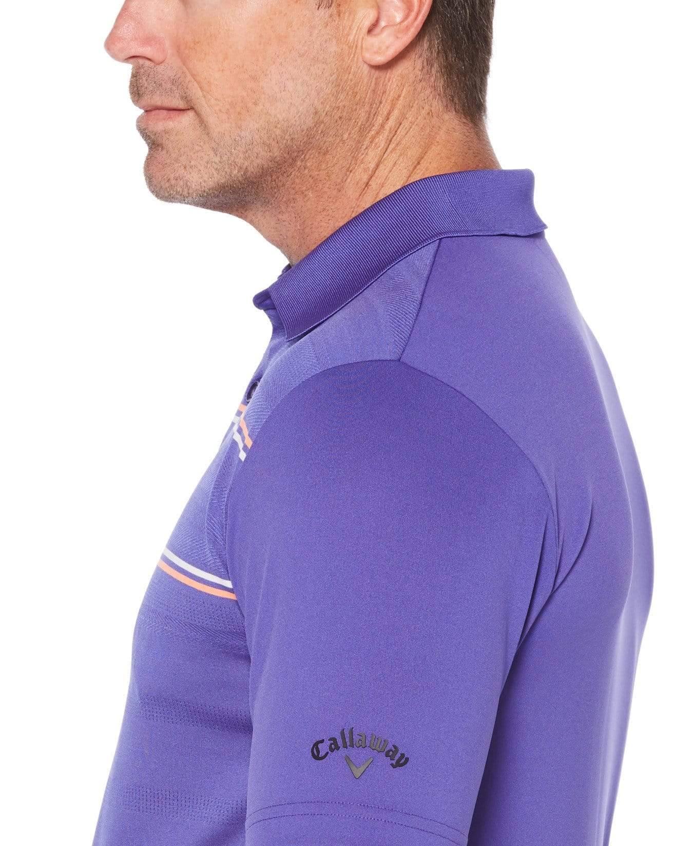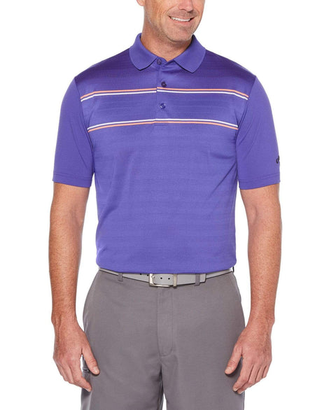 Earn an exemption in this engineered stripe short sleeve polo from Callaway. Light-hued horizontal stripes set the tone for a clean, stylish polo that doubles for golf attire and businesswear. The stripes move closer together through the chest, being separated by two thin colored stripes on the top and bottom. Callaway's Opti Dri™ moisture wicking technology pulls sweat away from your body to keep you cool in the heat and ventilated fabric is engineered to keep you cool by circulating air through the garment.