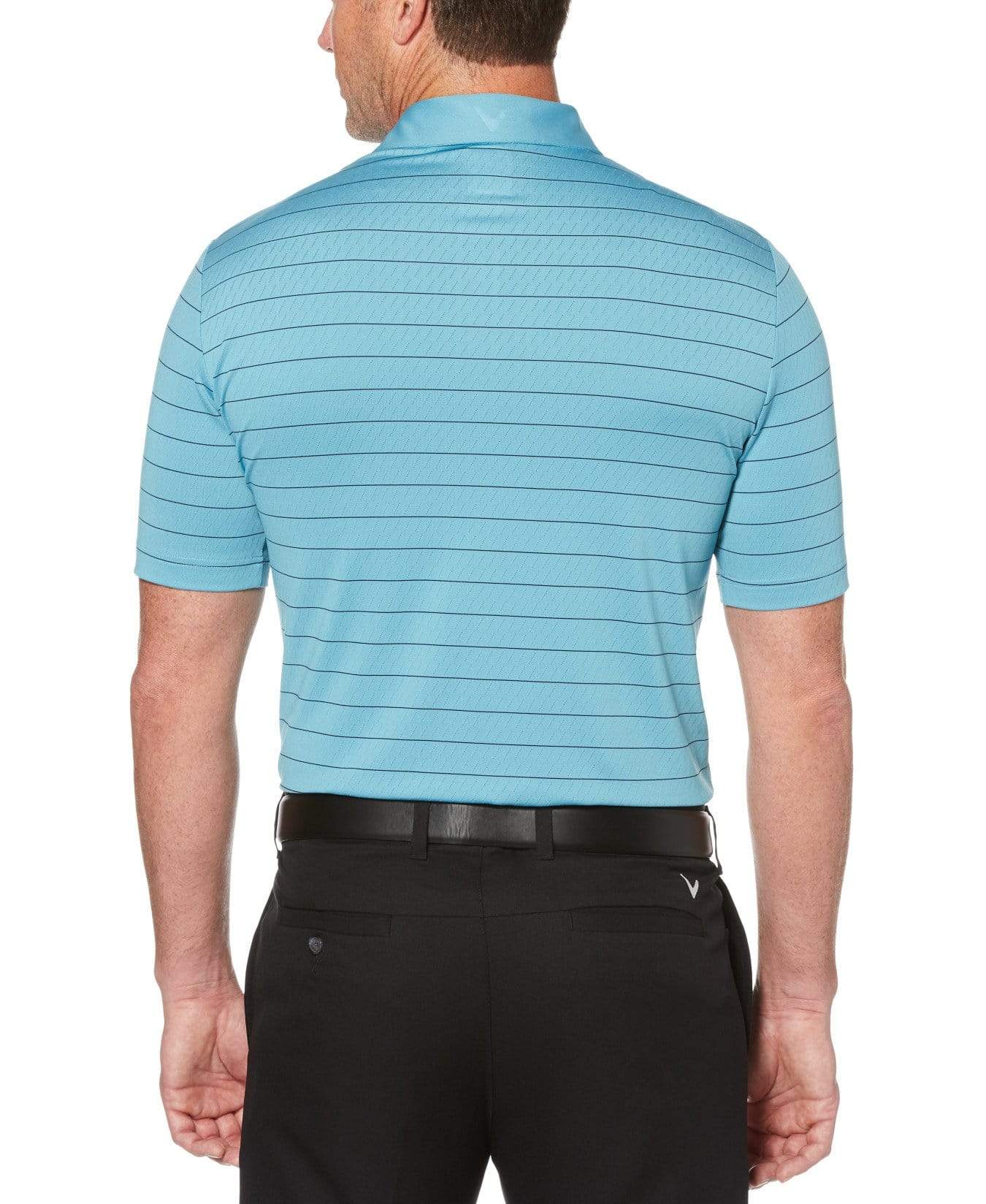 Don't let the the hot weather cool your game. This Callaway striped short sleeve polo is the perfect shirt for beating the heat. Small, diagonal slits in the jersey fabric allows air to filter through the polo, maximizing breathability on and off the course. Thin horizontal stripes add a classic element to your round of 18. Callaway's Opti Dri™ moisture wicking technology pulls sweat away from your body to keep you cool in the heat, stretch fabric is created by interwoven layers that ensure maximum range of motion, ventilated fabric is engineered to keep you cool by circulating air through the garment, and UPF 50 provides superior protection by blocking the sun's harmful UV rays.