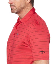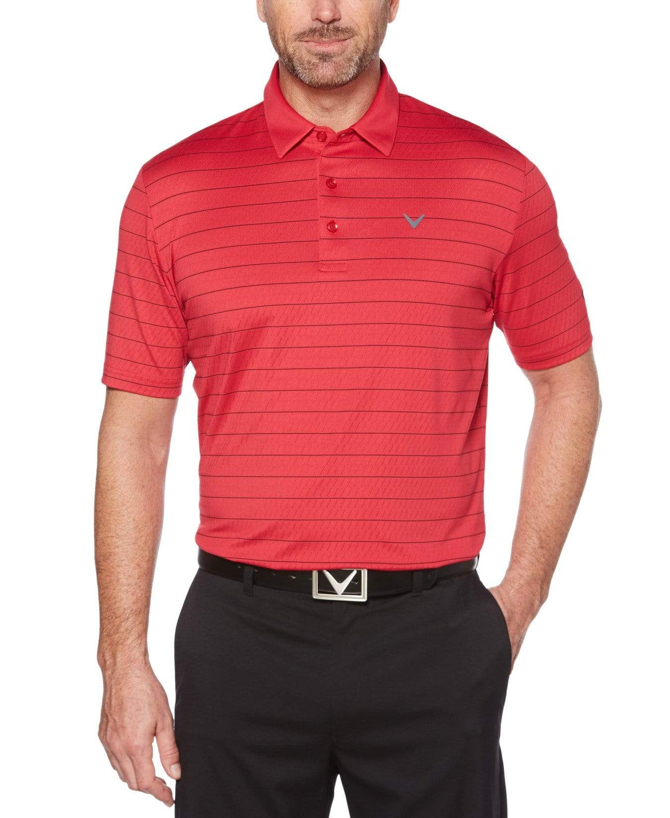 Don't let the the hot weather cool your game. This Callaway striped short sleeve polo is the perfect shirt for beating the heat. Small, diagonal slits in the jersey fabric allows air to filter through the polo, maximizing breathability on and off the course. Thin horizontal stripes add a classic element to your round of 18. Callaway's Opti Dri™ moisture wicking technology pulls sweat away from your body to keep you cool in the heat, stretch fabric is created by interwoven layers that ensure maximum range of motion, ventilated fabric is engineered to keep you cool by circulating air through the garment, and UPF 50 provides superior protection by blocking the sun's harmful UV rays.