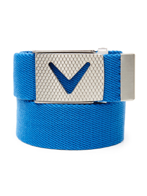 Gain ball speed while keeping your waist snug through your backswing with our Webbed Chev Belt. We imprinted a debossed hexagon texture into the belt buckle to mimic the same styling on golf balls and finished your belt with a cutout Callaway Chevron TPU Logo on the buckle. This belt fits up to a size-38 waist. But if you're smaller than a size 38, it trims easily so you don't have too much excess belt sticking out of the buckle.