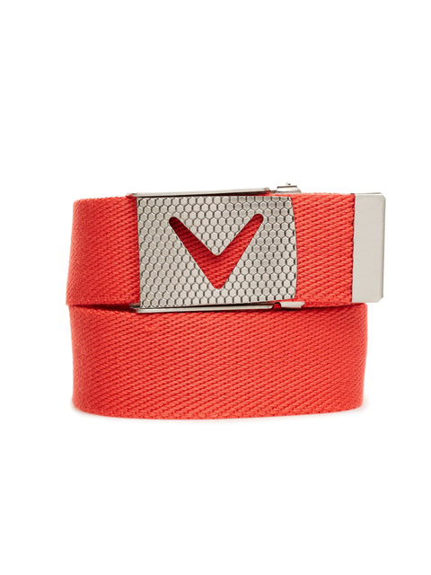 Gain ball speed while keeping your waist snug through your backswing with our Webbed Chev Belt. We imprinted a debossed hexagon texture into the belt buckle to mimic the same styling on golf balls and finished your belt with a cutout Callaway Chevron TPU Logo on the buckle. This belt fits up to a size-38 waist. But if you're smaller than a size 38, it trims easily so you don't have too much excess belt sticking out of the buckle.