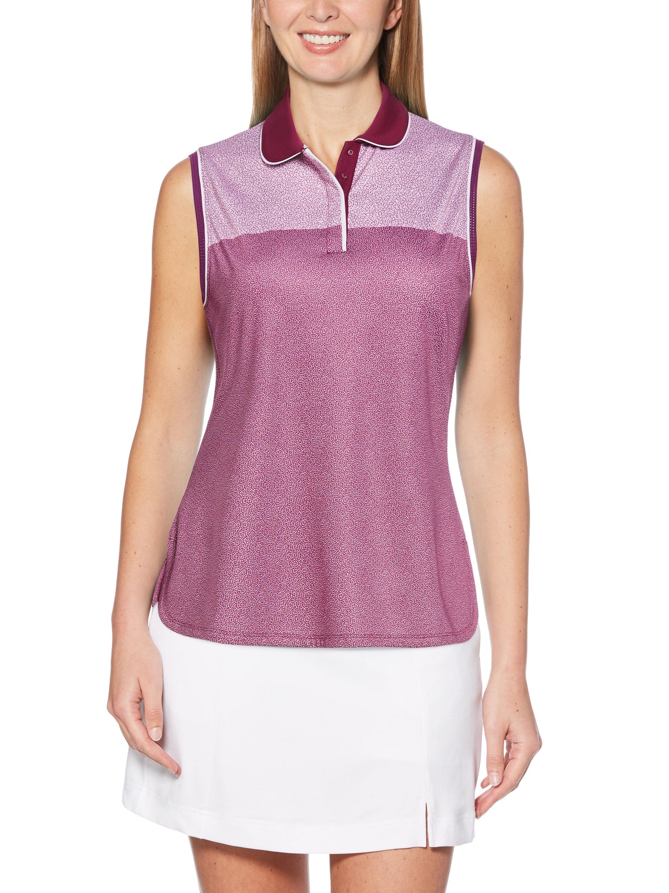 A mini leaf print and color blocking create a sophisticated look for this Callaway golf polo shirt. The sleeveless golf top features Opti Dri™ technology to keep you dry by wicking moisture away from your body. Stretch in the soft jersey material allows you to swing with ease. UPF 50+ protection helps prevent UV rays from penetrating the fabric. Play your game in style and comfort.