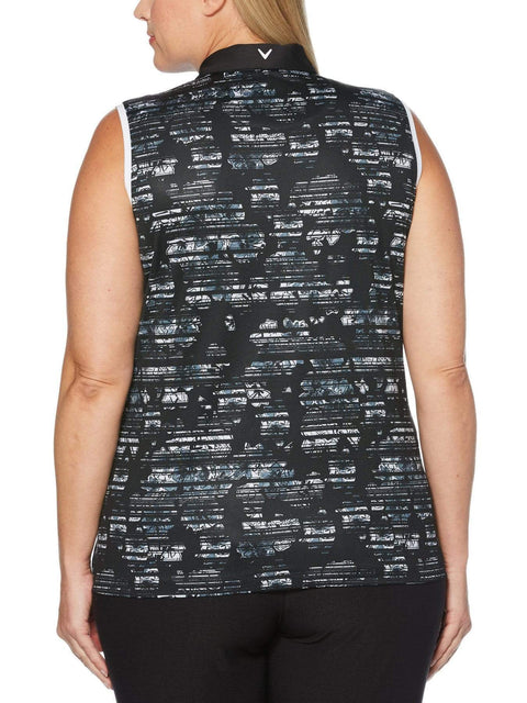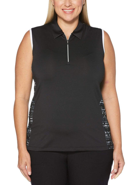 Tee off in style this spring with this sleeveless women's golf shirt. An eye-catching stainglass floral print covers the back and sides of this ladies golf top while the front and collar are solid for contrast. High quality stretch fabric lets you swing in comfort and moisture-wicking technology helps keep you cool and dry.