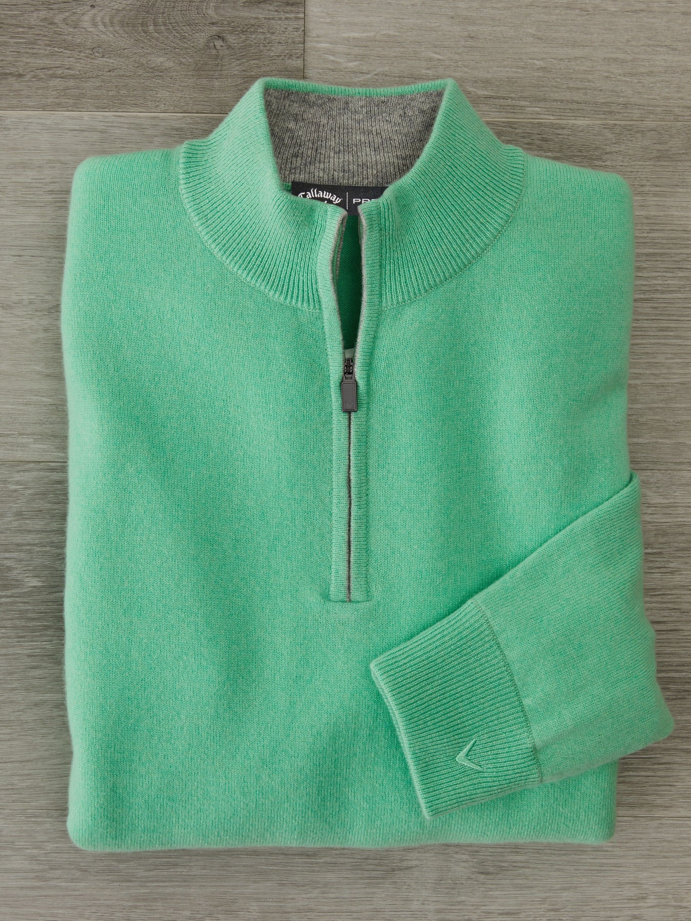 This men's golf sweater from Callaway is ideal for layering on chilly days. Designed to keep you looking sharp and feeling warm, this golf pullover is crafted from 100% cashmere for a luxe look and feel. It also features durable double ply fabric for long-lasting wear with a golf-approved double-knit hem and cuffs and a quarter zipper closure for a comfortable fit.