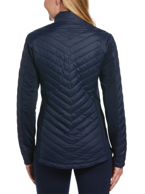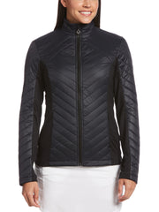 Chilly weather won't stop you from getting your game in with this Callaway golf jacket. The thermal women's jacket has a mixed media design with quilting on the front and arms and slimming solid panels on the sides. A full zip and high collar let you adjust your coverage depending on the weather. Stretch in the material lets you swing smoothly on each stroke for a successful day on the course. Plain weave fabrication makes this jacket a durable choice to stay warm and comfortable no matter what the weather brings.