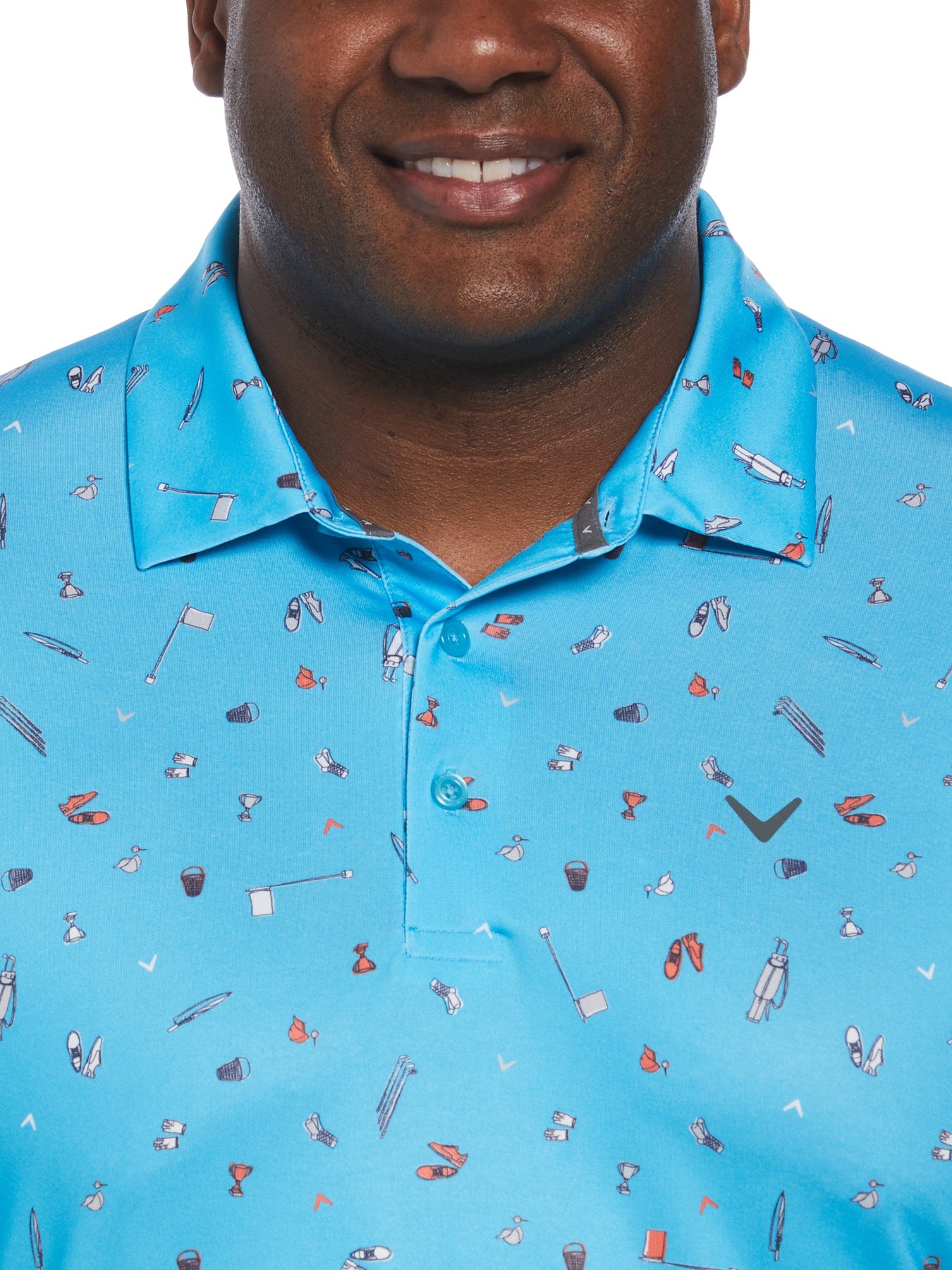 Stay stylish and comfortable on the course in this Big & Tall golf shirt from Callaway. This golf polo shirt features Opti-Dri™ moisture-wicking technology and stretch fabric for a full range of motion. It's finished with an all-over golf print, short sleeves and soft jersey fabric with added sun protection to fuse function and fashion.