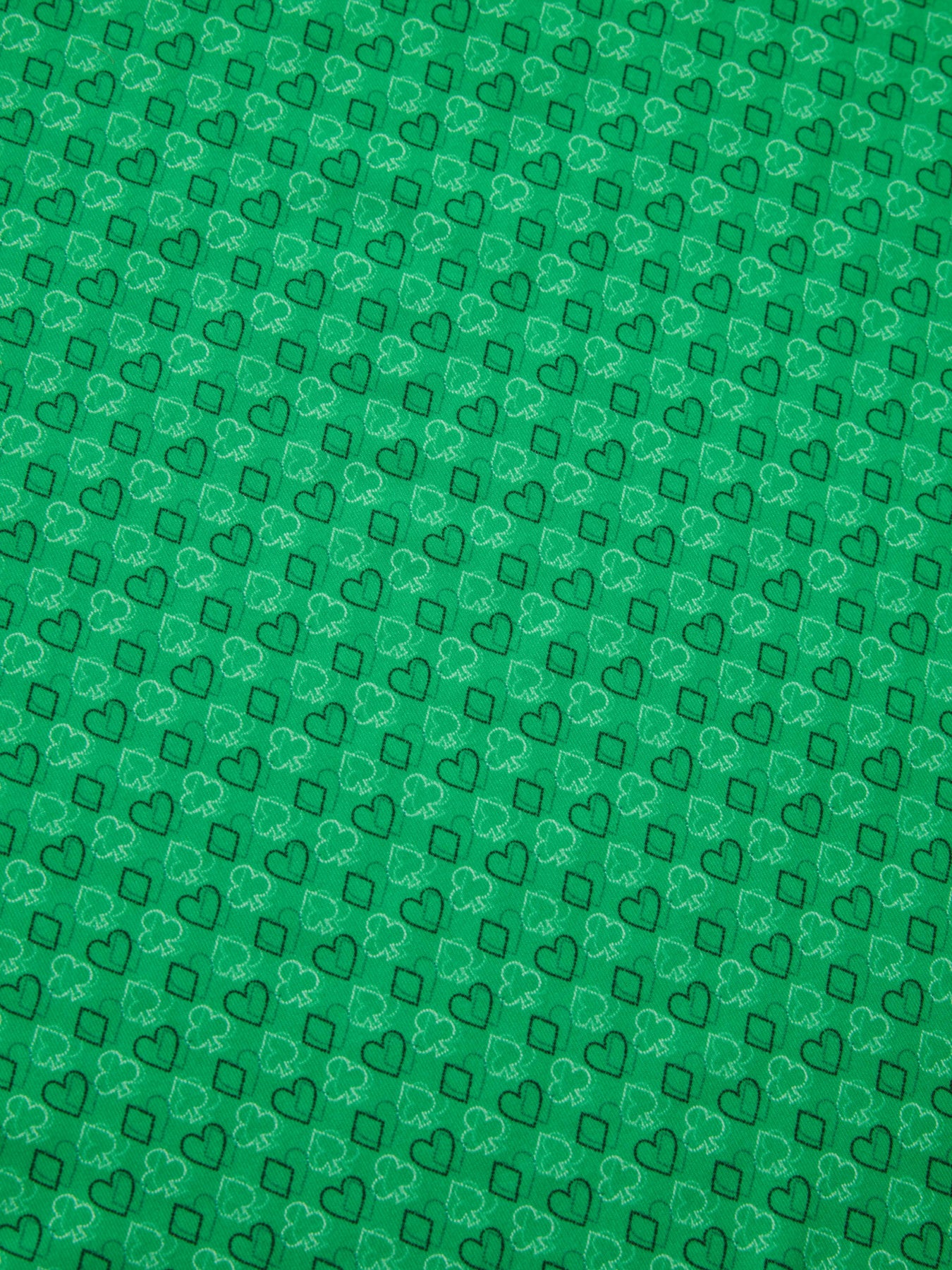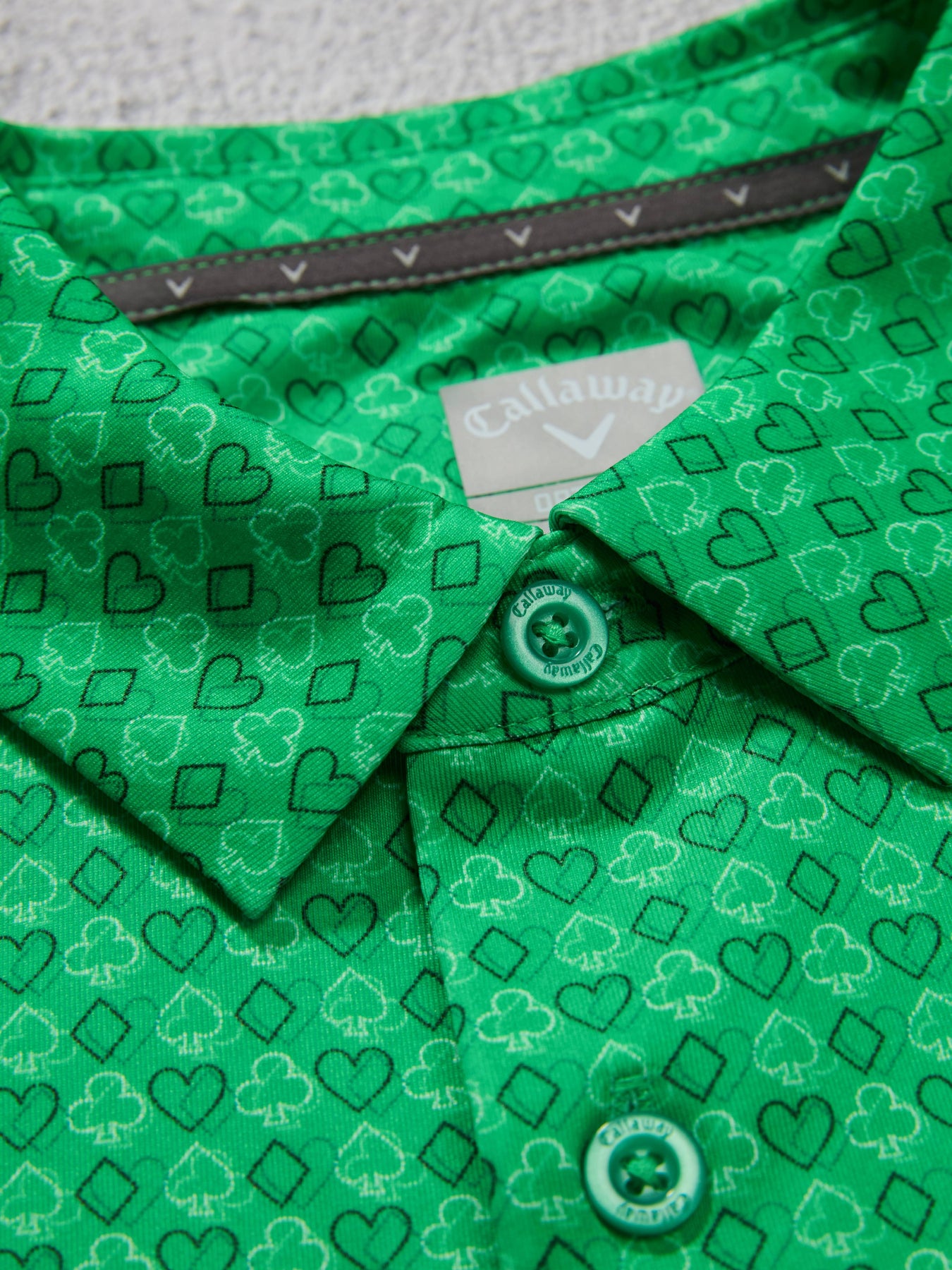 Embrace your lucky streak on the course with this striking Mens Lucky Cards Print Polo. This golf polo delivers exceptional performance with Opti Dri™ moisture-wicking technology to keep you comfortable through every swing. Protected by sun-blocking fabric and imported for quality assurance, this green and white polo combines style and functionality for the golfer who believes in good fortune.