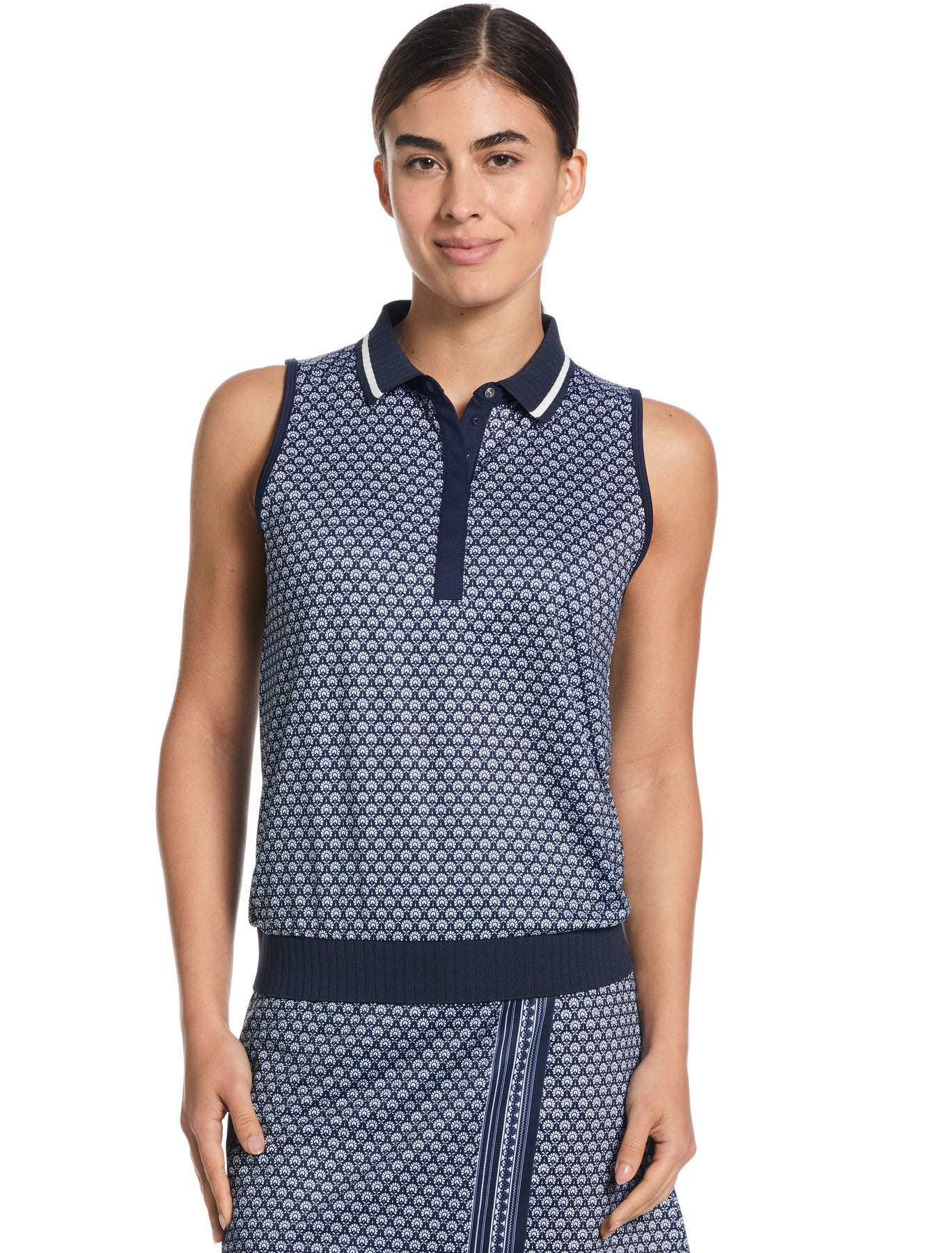 This Callaway Apparel women's golf polo is a versatile and stylish choice for any active golfer. Crafted from a lightweight jersey fabrication made with recycled polyester, it offers a thoughtful blend of performance and comfort. The chic all-over print adds a sophisticated touch, ensuring you look sharp on and off the course. Featuring a classic self collar, this women's golf shirt seamlessly combines modern style with high-performance features for an exceptional fit.