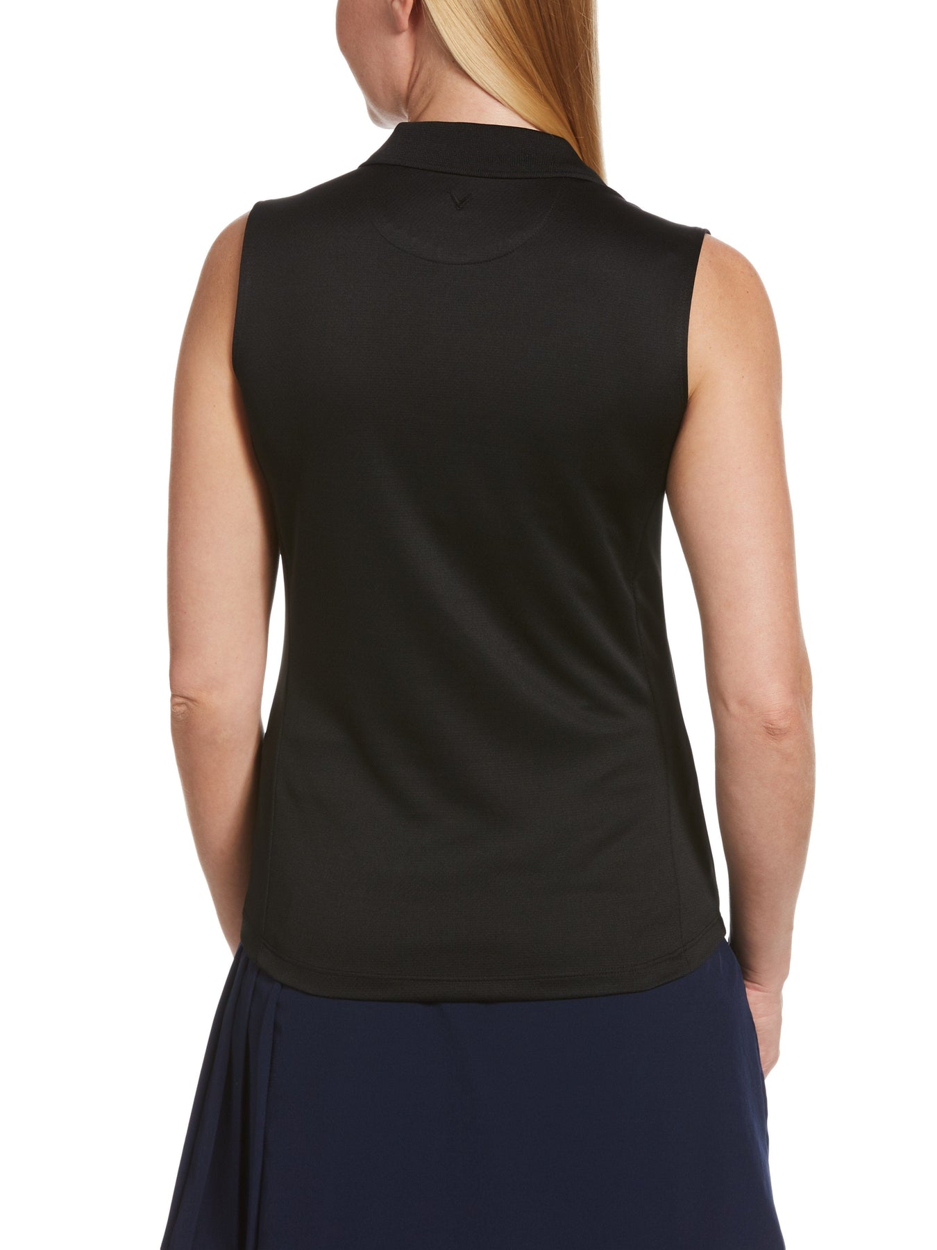 Stay cool and comfortable out on the course in this versatile solid-colored Callaway women's golf shirt. The sleeveless ladies' golf top has moisture wicking and cooling technology to help keep you feeling fresh. It's crafted from a textured fabric for added visual interest, and the material features a hint of stretch for enhanced range of motion and a flexible fit.