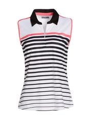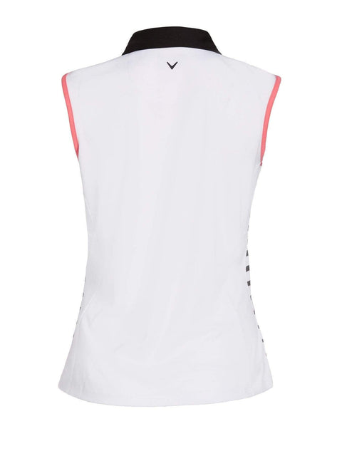 Featuring a bold and dynamic design, this sleeveless golf shirt from Callaway will be an eye-catching addition to any woman's athletic wardrobe. The golf polo is decorated with slim stripes down the front that gradually get thinner towards the hem and contrast-colored trim along the shoulders and armholes. The ladies' golf top is made with soft and slightly stretchy interlock knit fabric. It has moisture-wicking technology to help keep you dry and comfortable.
