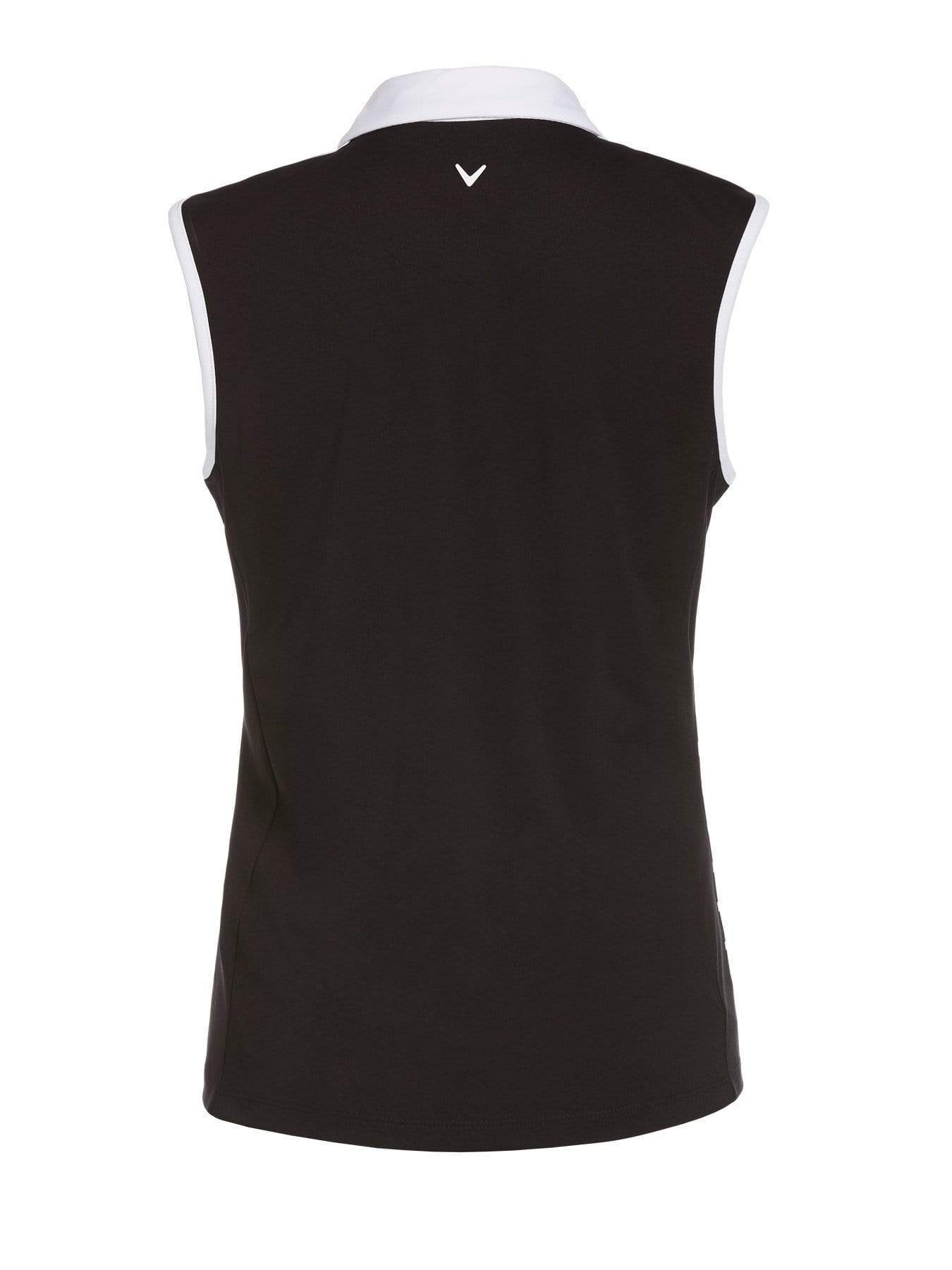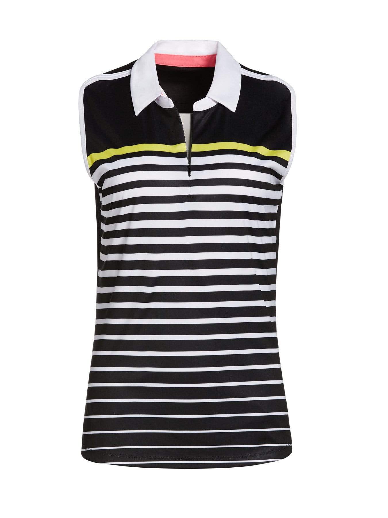 Featuring a bold and dynamic design, this sleeveless golf shirt from Callaway will be an eye-catching addition to any woman's athletic wardrobe. The golf polo is decorated with slim stripes down the front that gradually get thinner towards the hem and contrast-colored trim along the shoulders and armholes. The ladies' golf top is made with soft and slightly stretchy interlock knit fabric. It has moisture-wicking technology to help keep you dry and comfortable.