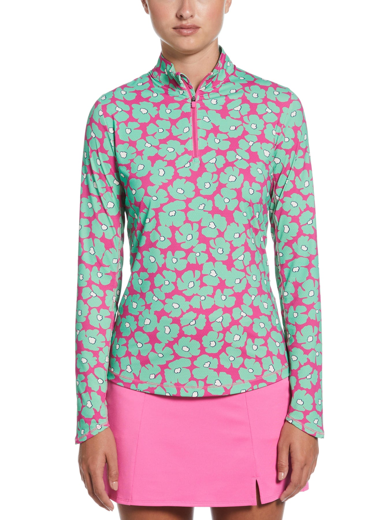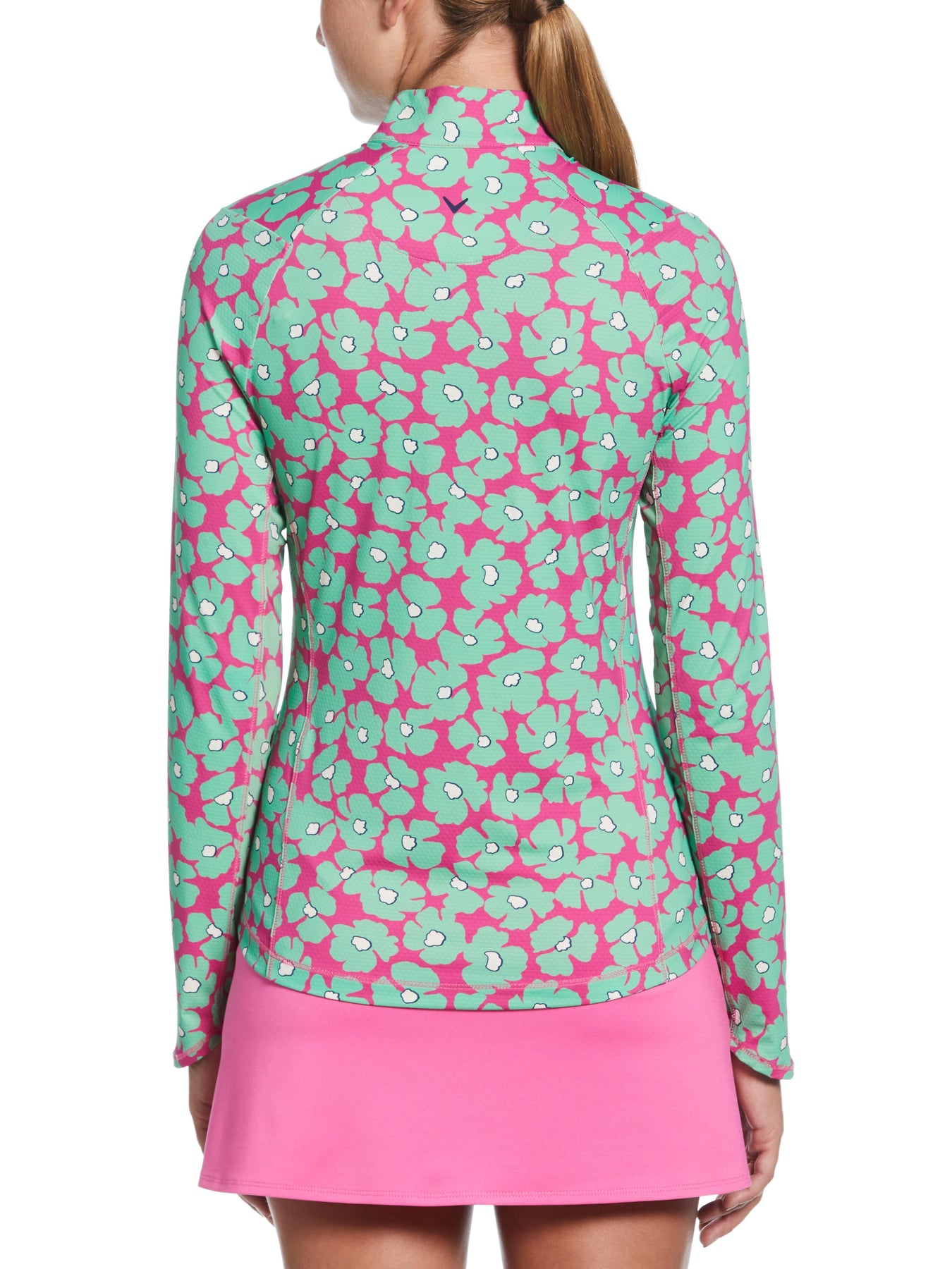 Stay protected and stylish on sunny days with this Callaway Apparel's floral printed long-sleeve shirt. Crafted from a comfortable blend of 90% nylon and 10% elastane, this top offers a full range of motion thanks to its stretch fabric and Swing Tech™ technology. Opti•Dri™ moisture-wicking technology keeps you dry and comfortable, while the floral print adds a touch of feminine flair. With sun protection and endorsement from the Skin Cancer Foundation, this mock neck shirt is perfect for active days outdoors.