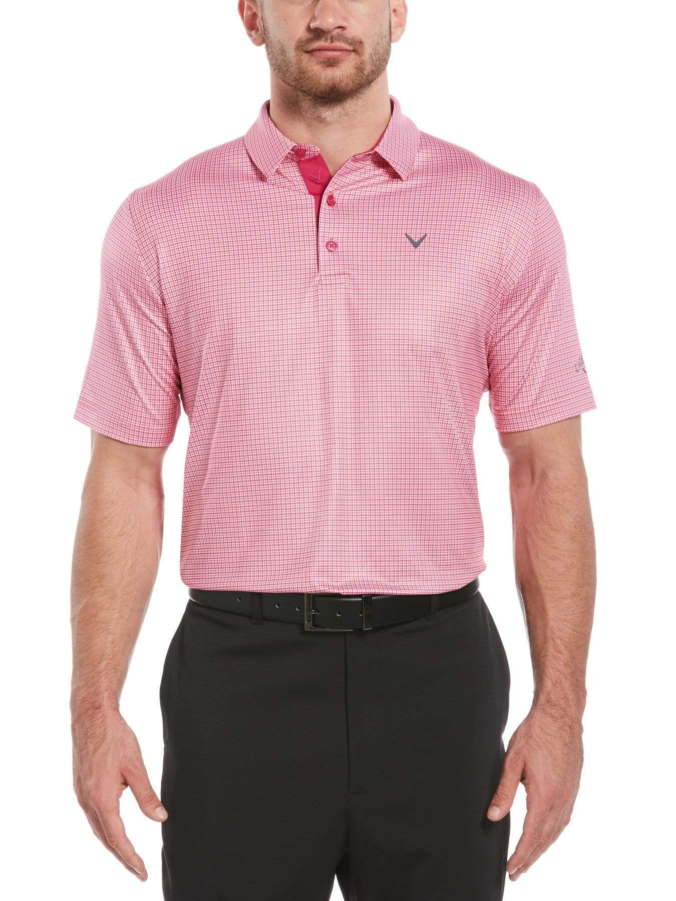 A unique micro tattersall print gives this Callaway golf polo visual appeal to go with its impressive performance. Swing Tech provides greater flexibility through the shoulders, delivering enhanced range of motion with every swing. Complete with a three-button placket and self collar, this lightweight men's golf shirt is an optimal blend of fashion and function.