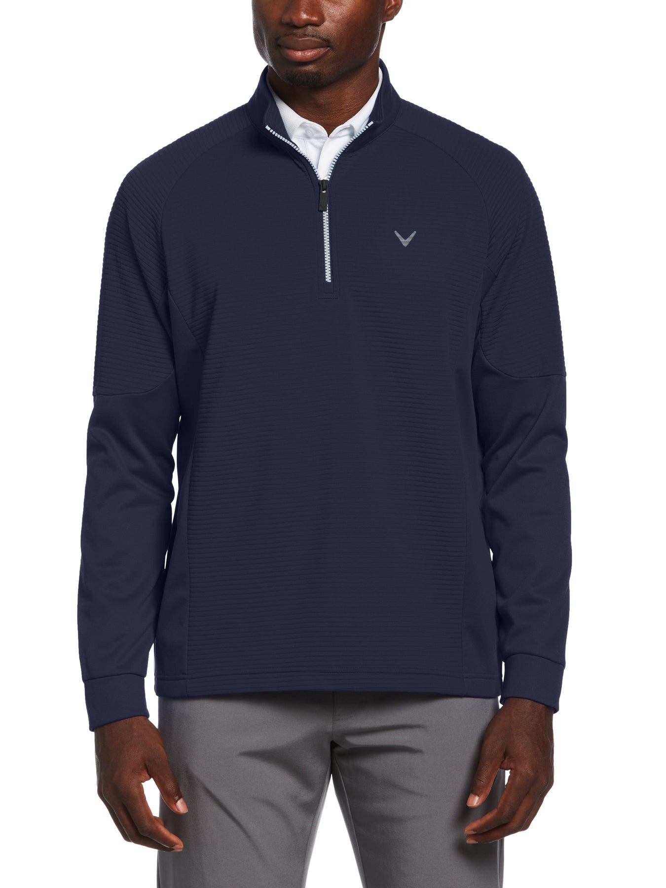 This Callaway golf pullover is crafted for warmth with soft light fleece that won't weigh you down. Thick, double-knit thermal fabric creates a barrier between you and the cold. Opti Dri moisture wicking helps to keep you comfortable and dry, while sun protection blocks harmful UV rays from penetrating through the fabric. A 1/4 zip collar makes it easy to remove the men's golf pullover if the weather warms up.