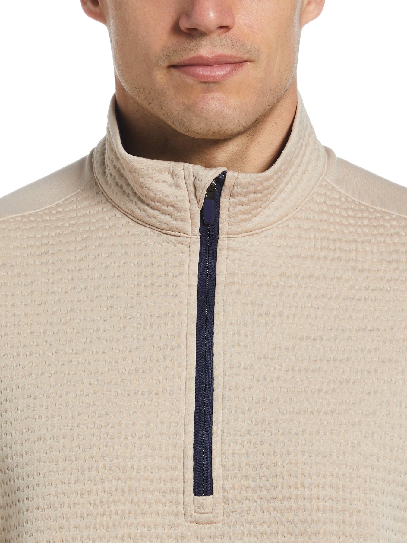 From the Weather Series™, this Callaway men’s golf pullover will help you stay prepared for changing conditions out on the course and out on the town. The sleek quarter zip golf sweater is crafted from a durable double knit fabric, which helps to ensure you can rely on it for seasons to come. It features moisture-wicking technology to help manage sweat, so you can stay focused on your game when the competition heats up. The thermal fabric helps you stay warm and comfortable during the cooler months, and it’s textured to add some flair to your athletic attire. The high mock collar protects your neck from the wind and rain, while contrast-colored panels on the sides and sleeves enhance the sleek, modern design. Zippered pockets keep small essentials within close reach throughout your round.