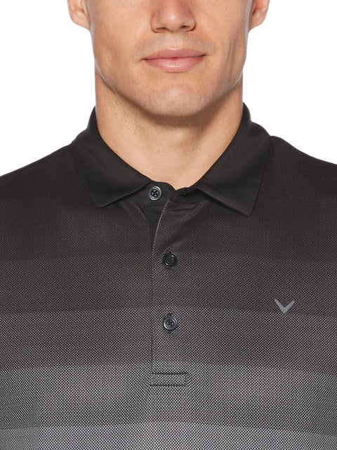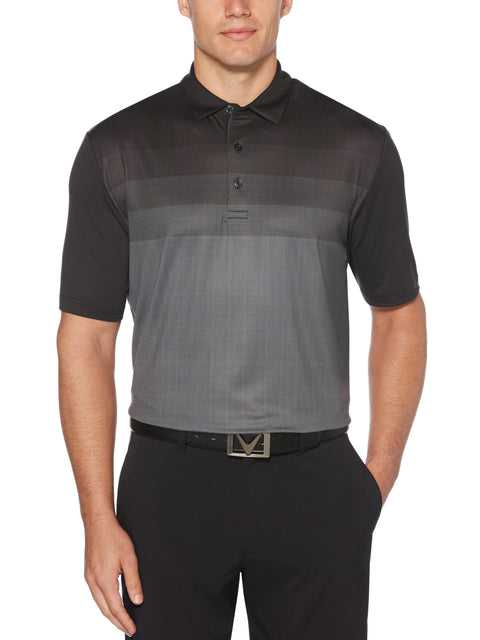 This lightweight men's golf shirt from Callaway features a tonal gradient that is both subtle and sophisticated. Designed to enhance performance, the lightweight stretch fabric delivers a full range of motion for a smooth swing. Moisture-wicking technology keeps you cool and dry, and UPF 50 safeguards against the sun's harsh UV rays. Comfortable and stylish, this golf polo puts the focus on your game.