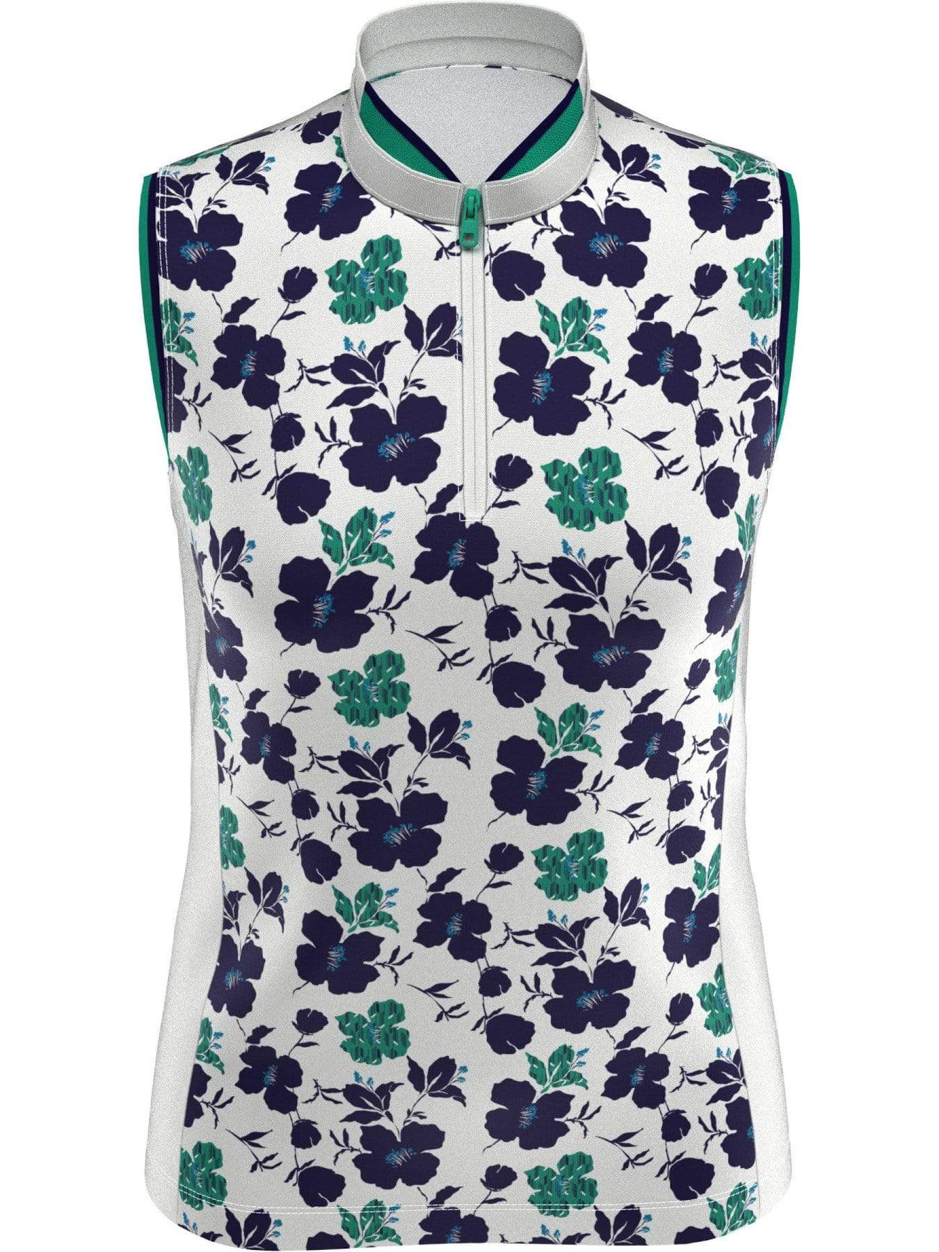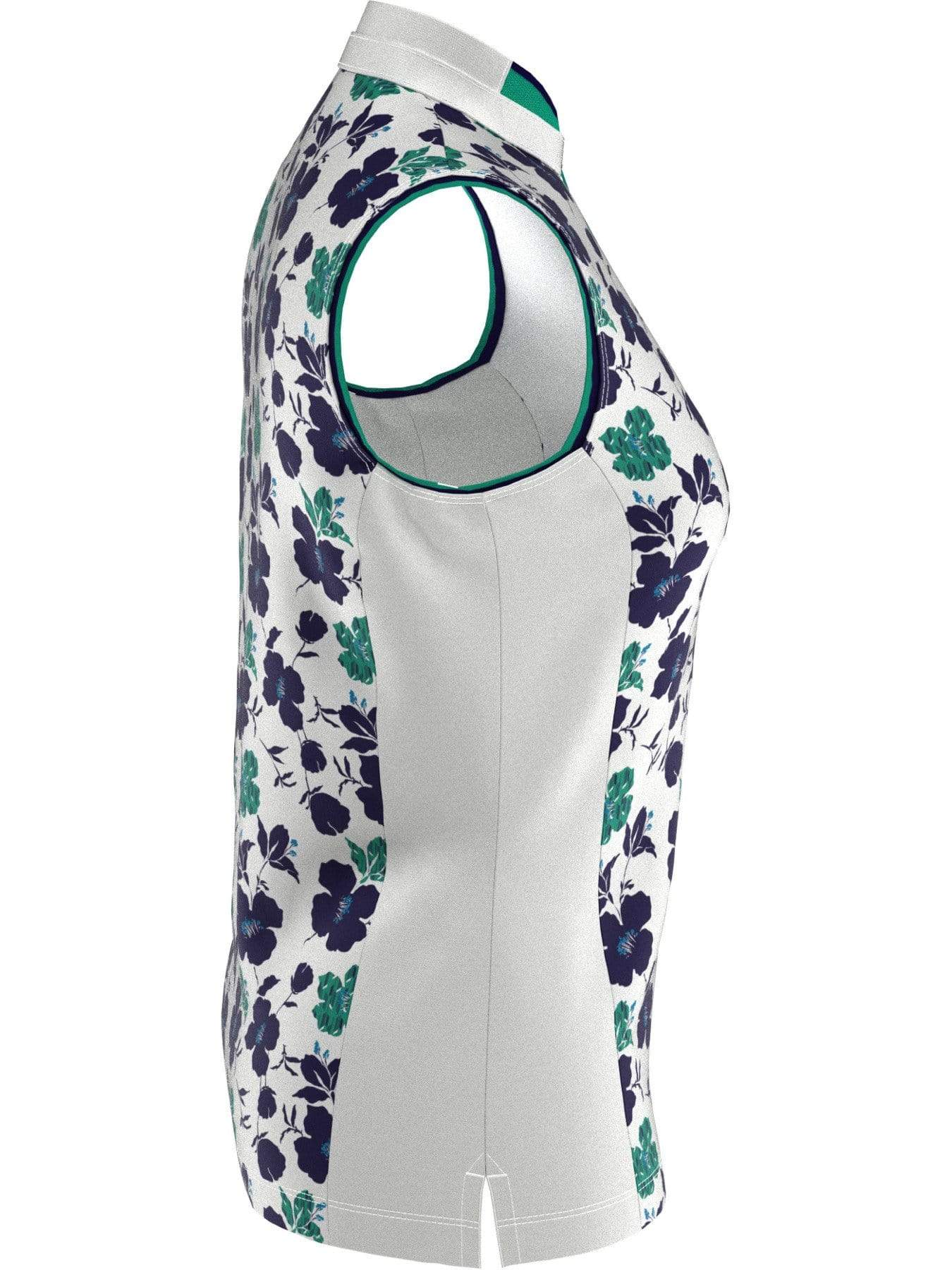Outlines of tropical flowers bring some island flair to this comfortable Callaway sleeveless golf shirt. The ladies' golf polo is made from durable double knit fabric, with allover ventilation to help keep you cool. Moisture-wicking technology helps to prevent sweat from lingering, while a contrasting solid-colored ribbed collar and matching zipper add some extra visual punch to the look.