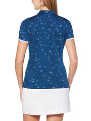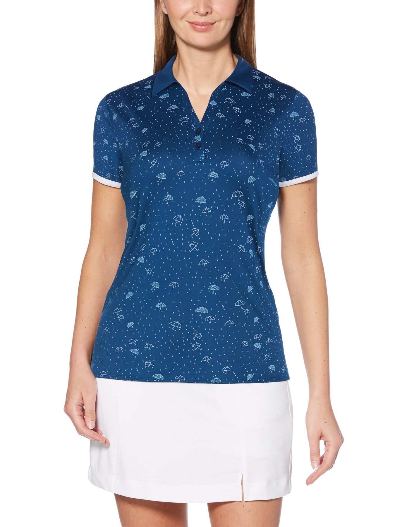 A fun conversational umbrella print along with a variety of performance features makes this Callaway golf shirt a great choice no matter the weather. Opti Dri™ technology keeps you cool and dry by wicking moisture from your skin. Stretch jersey fabric allows you to swing with ease in total comfort and UPF 50+ sun protection keeps your skin protected by preventing UV rays from penetrating the material. There are so many reasons to make this women's short sleeve golf top your own.