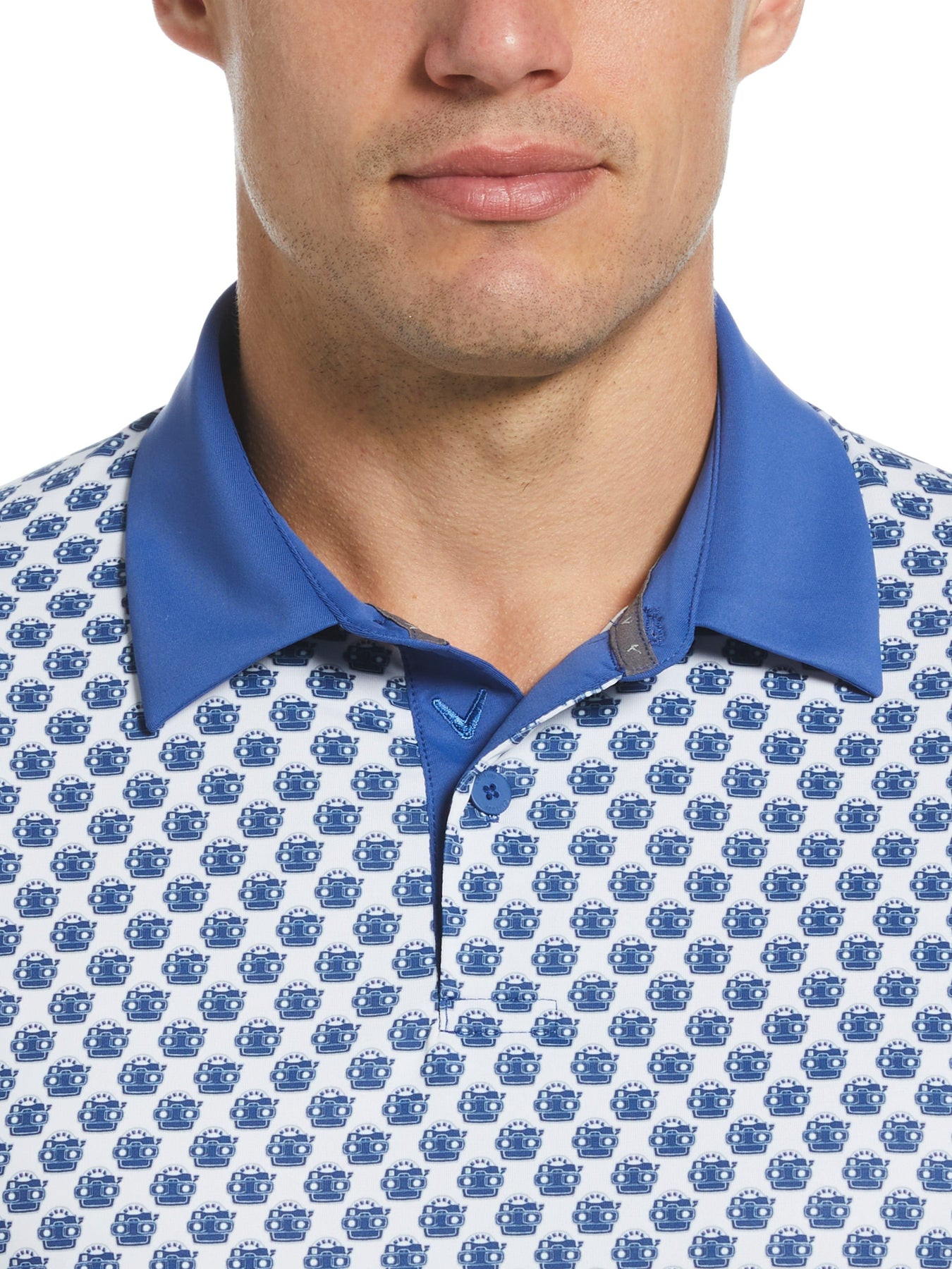 Take in the view out on the course or on nights out with the guys in this eye-catching printed golf shirt from Callaway. Covered with a stylish view master print, the golf polo shirt is crafted from a lightweight single knit fabric for all-season comfort. It has sun protection technology built in to help you enjoy your round safely, and the material wicks away moisture to help keep you dry. A generous amount of stretch in the fabric and Swing Tech™ technology combine to help provide a full range of motion, so you can make each swing with power and precision. An easy-care and eco-friendly option, the men’s golf shirt is crafted with 30% recycled polyester.