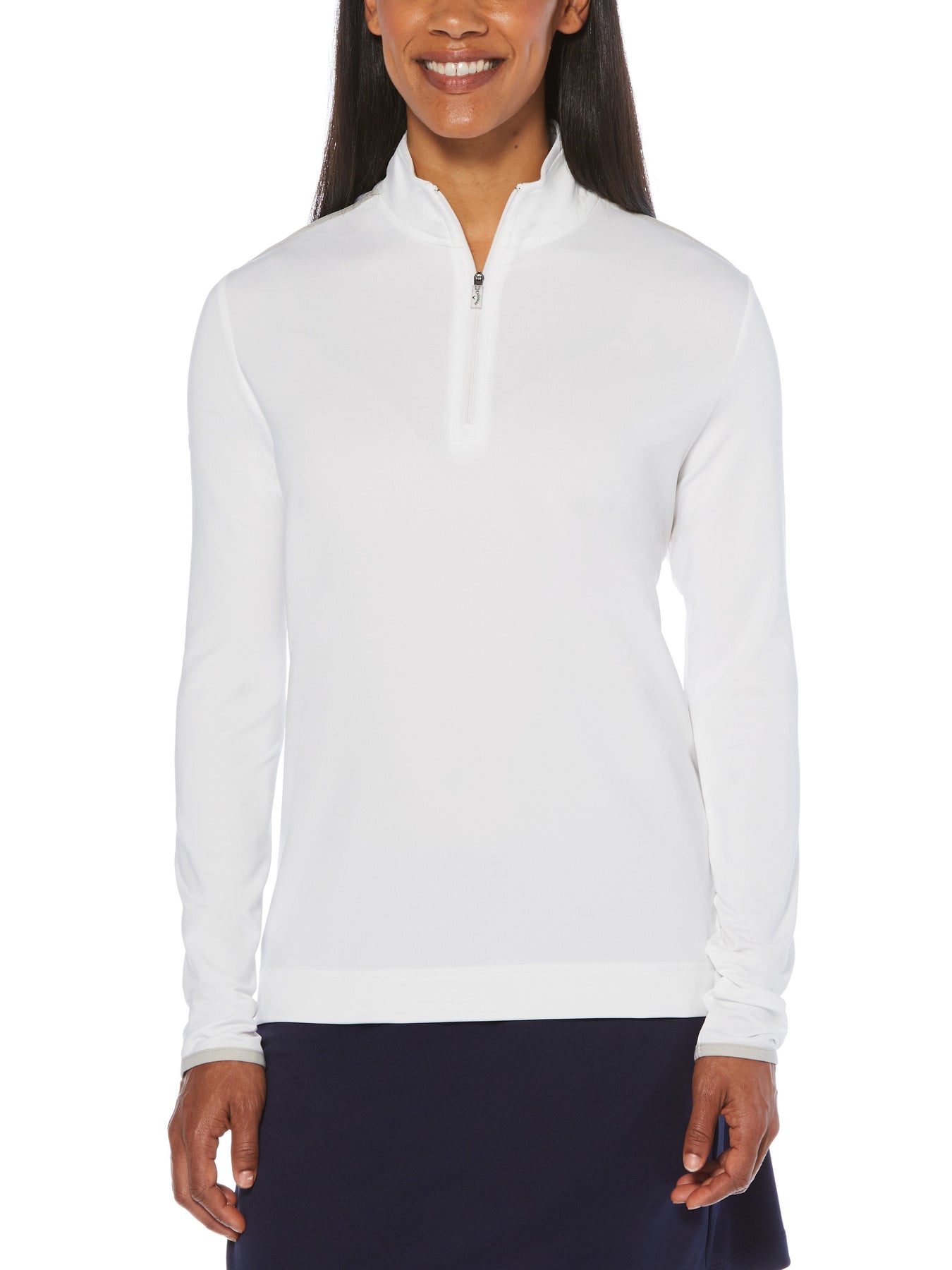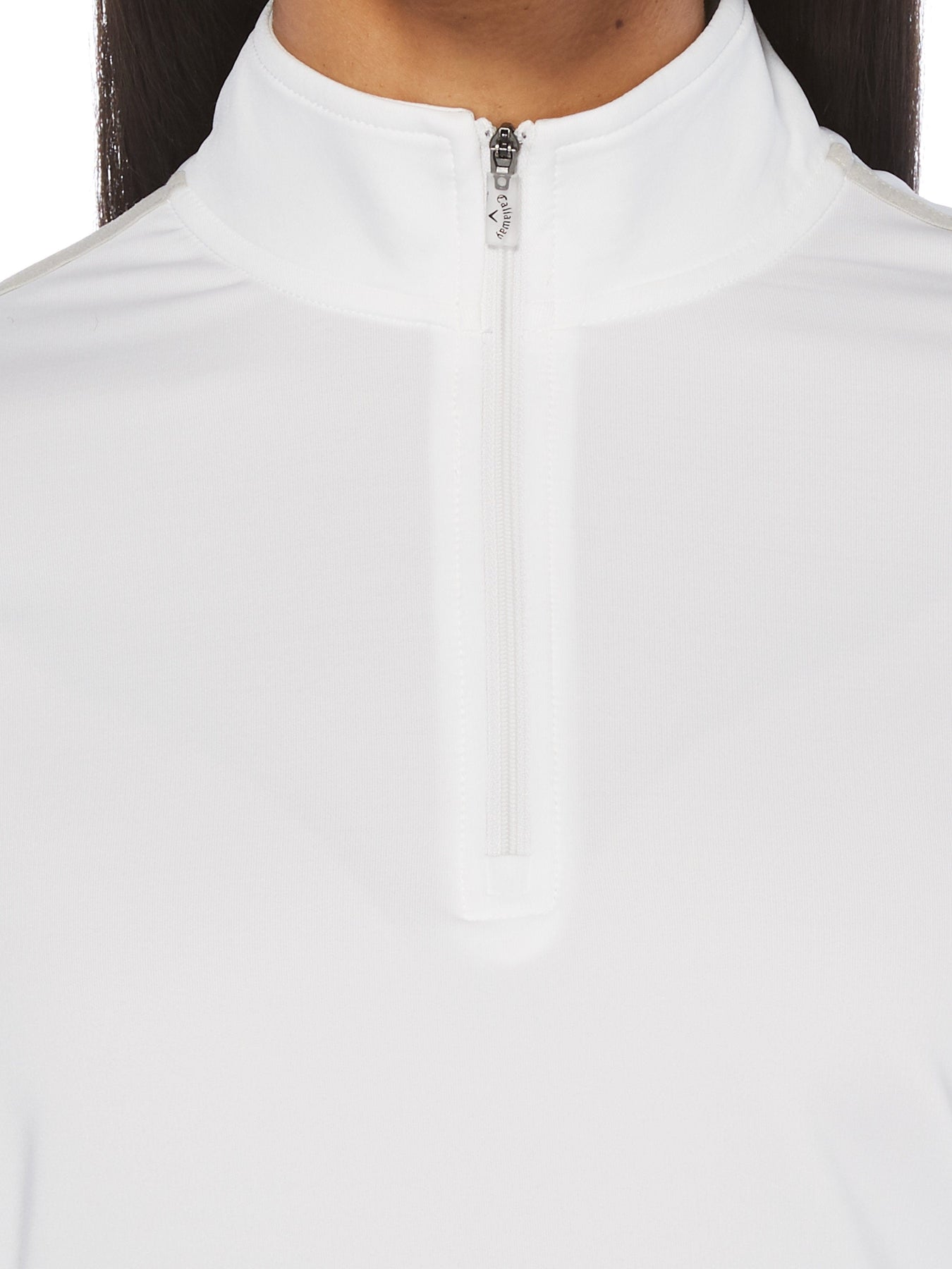 We'll help you move the needle in inclement weather with our Women's 1/4-Zip Mock Performance Pullover from the Callaway Standard Collection, which fuses our most classic look into a roomier fit. A little lighter than our 1/4-zip jacket, our mock pullover is crafted with French Terry to create an exterior with cross-looped texture. We finished it with a horizontal stripe across the shoulder and a Callaway Tour Logo on the right sleeve. Our Opti Dri™ moisture-wicking technology pulls sweat away from your body so you can cool down in the heat, Opti-Stretch allows you to attack the green by providing your arms the freedom to produce a fluid swing and Opti-Shield gives your skin superior protection against the sun's UV rays.
