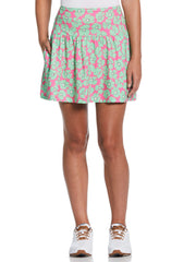 For eye-catching style on the course or beyond, choose this Callaway golf skort that has a ruffled hem and all-over floral print. Built with stretch and moisture-wicking technology, this women's golf skort delivers function as well as fashion. It's also crafted with recycled material, making it a more eco-conscious choice in your golf clothing collection.