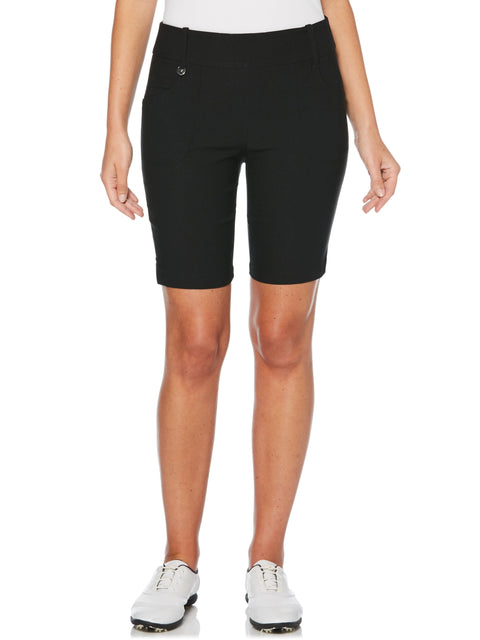 These Callaway women's golf shorts are crafted with an active waistband to help keep them in place as you bend, crouch and wind up for each swing. The versatile solid-colored golf shorts have an easy pull-on design that makes gearing up for your game a snap. Stretch fabric helps to maximize your range of motion, while pockets at the front and back make it easy to keep essentials close as you move around the course.
