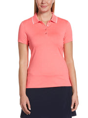A chevron print adds some fun to this classic Callaway women's golf shirt. The ladies' golf top is made with flex fabric and plenty of stretch to let you wind up and follow through smoothly during each swing. Opti Dri™ moisture-wicking moves perspiration away from your body to help you stay cool and dry. Contrast tipping on the ribbed collar gives the design some extra visual impact.
