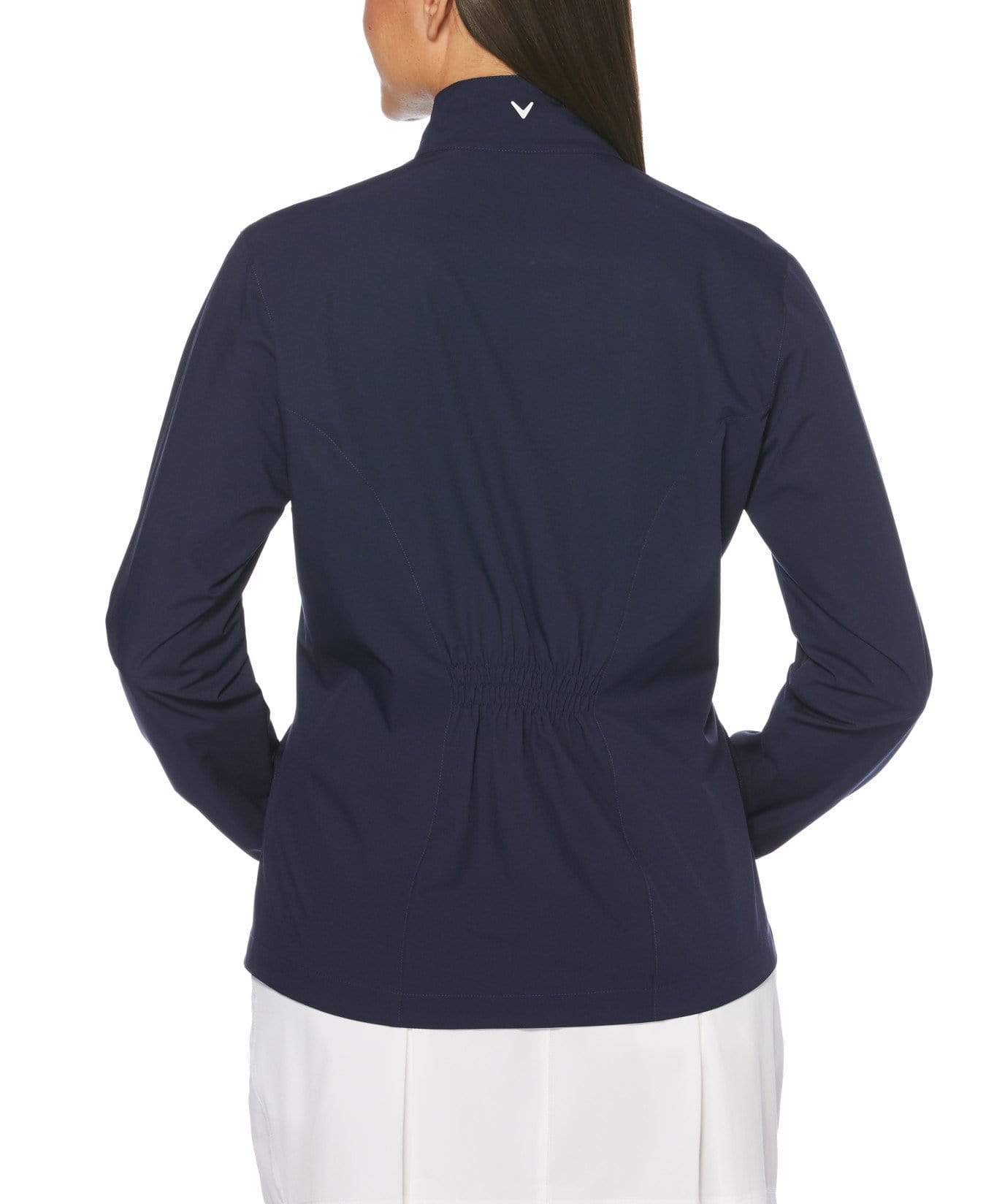 Brave the elements in style in the Callaway Womens Golf Performance Long Sleeve Wind Jacket With Back Ruching. A feminine, flattering fit with two front pockets is enhanced by ruching details along the back and an Opti-Repel barrier against wind and water.
