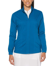Brave the elements in style in the Callaway Womens Golf Performance Long Sleeve Wind Jacket With Back Ruching. A feminine, flattering fit with two front pockets is enhanced by ruching details along the back and an Opti-Repel barrier against wind and water.