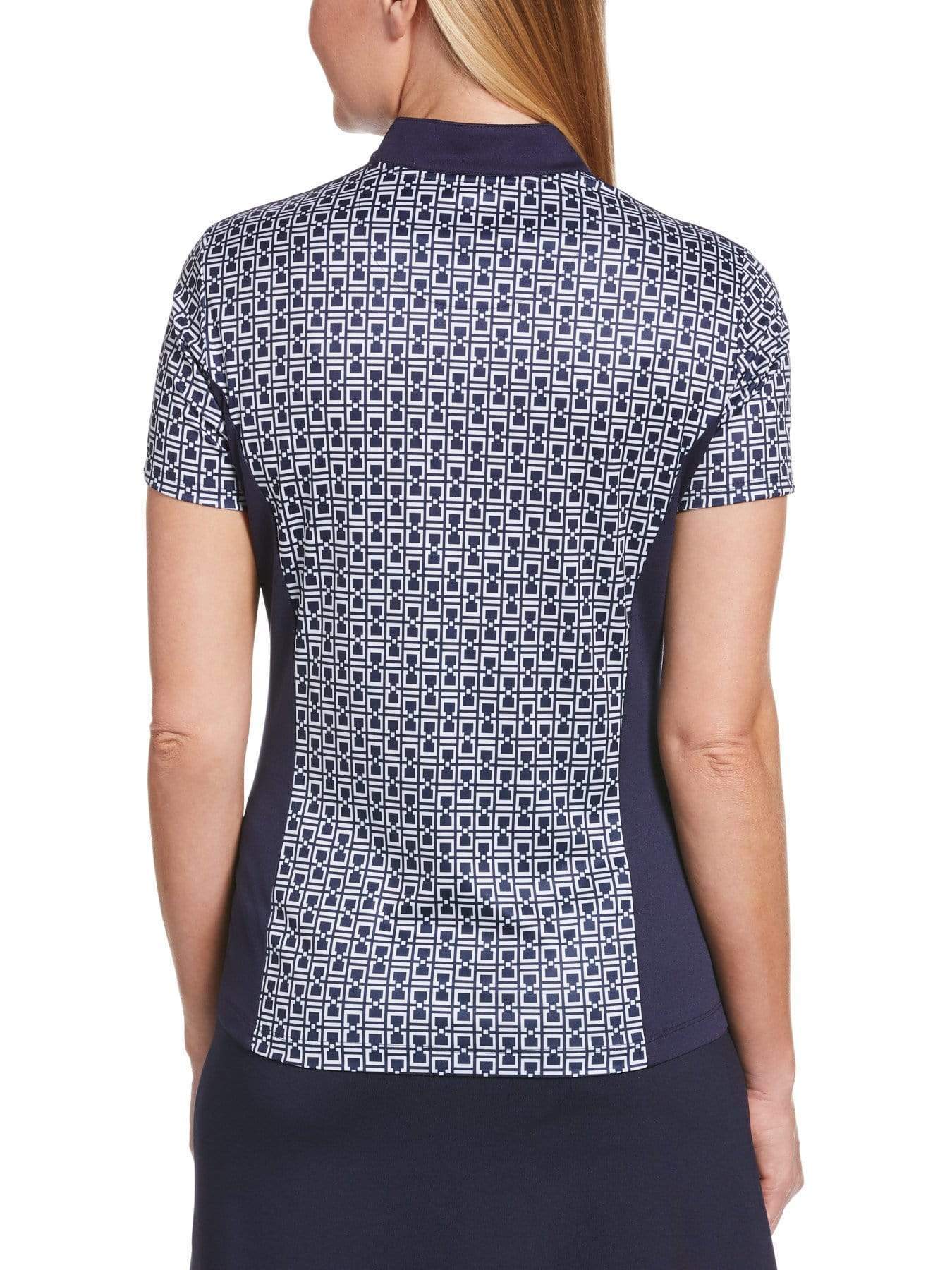Give your golf attire a fresh update with this cool geometric-printed polo shirt from Callaway. The women's golf shirt is equipped with moisture-wicking technology, which moves sweat away from your body to help speed up the fabric's drying time. Interlock knit construction gives the material natural stretch for a comfortable and flexible fit. Details like a mock neck and matching solid-colored panels along the shoulders and sides give it a sleek athletic look.