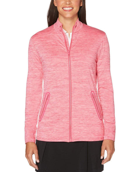 This heathered fleece golf jacket addresses your need for warm golf gear. Insulated thermal fabric creates a barrier between you and cold weather by keeping you warm. Stretch fabric ensures maximum range of motion. Fleece fabrication finishes extra soft for enhanced comfort..