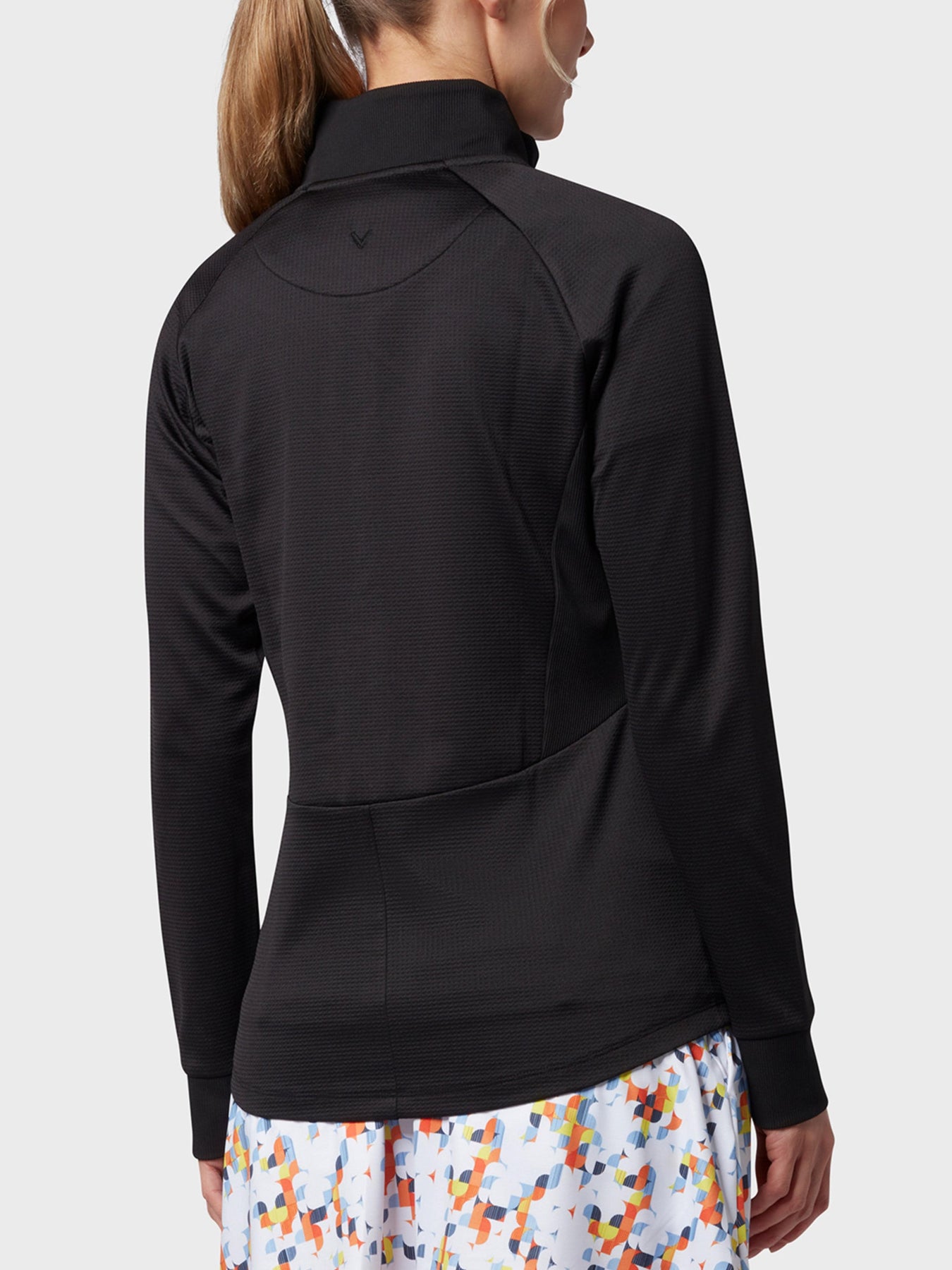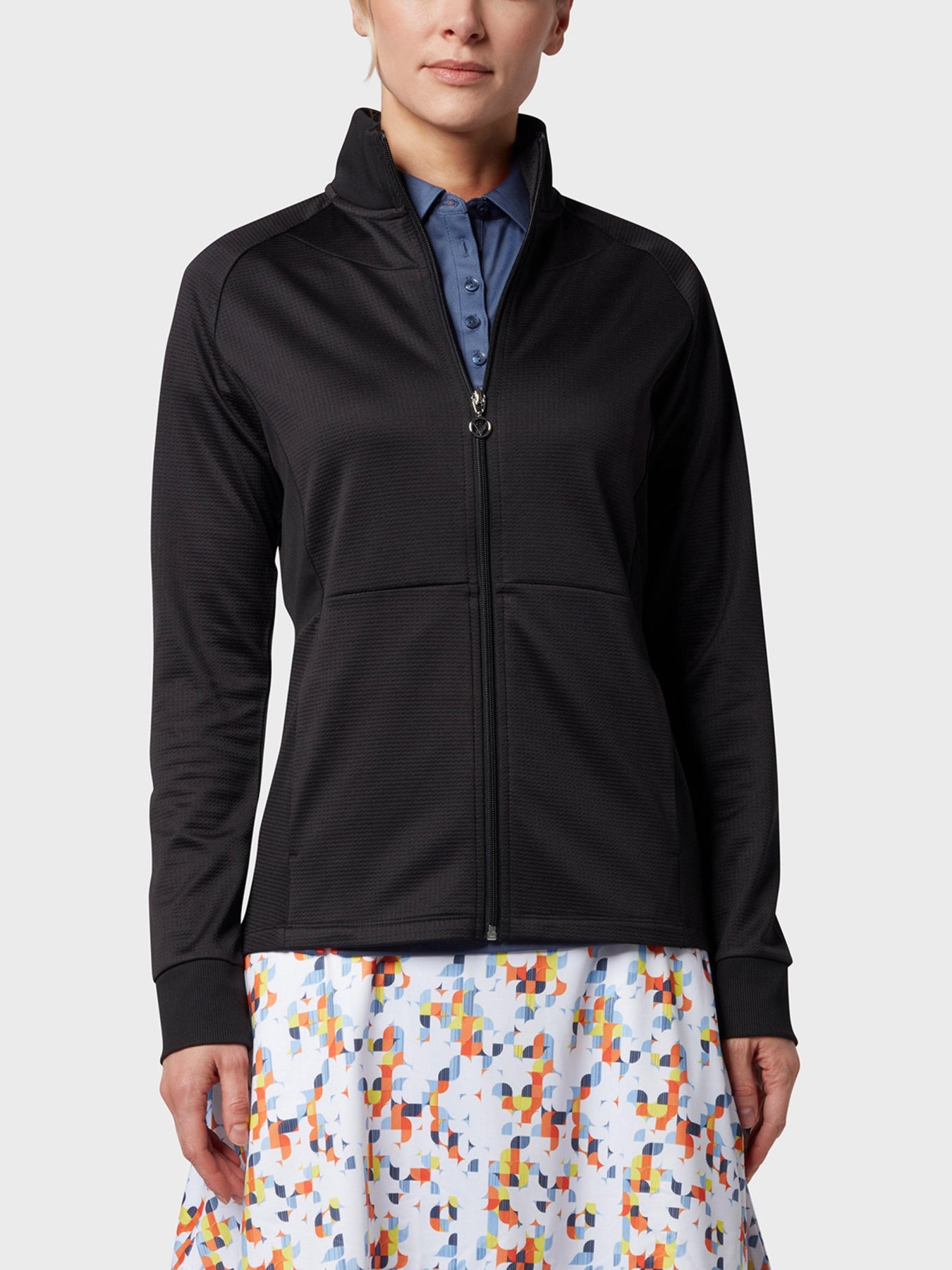 Comfort is par for the course with this cozy Callaway golf jacket. Soft, lightweight fleece combined with thermal fabric keeps you warm when playing in cooler weather. Added stretch lets you swing smoothly down the fairway, and a flattering fit has you looking stylish while you do it. The functional full-zip jacket features a mock neck and fitted cuffs for protection from the wind.