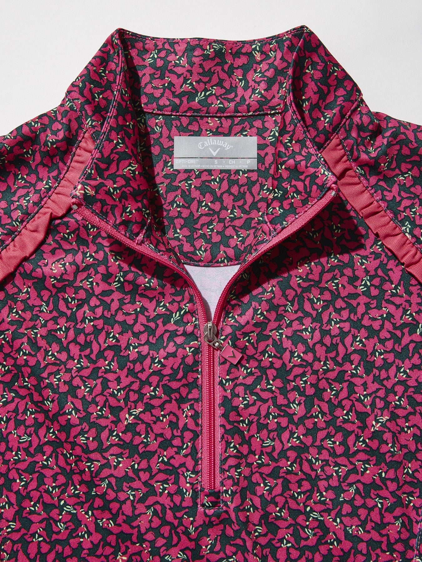 This eye-catching women's golf shirt from Callaway is crafted from lightweight and breathable jersey fabrication with added stretch for full range of motion with every swing. Opti Dri™ moisture wicking technology built into our womens golf shirts pulls sweat away from the body for on-course comfort throughout your round. The sleeveless shirt features a floral print with ruffles for feminine flair, while a mock neck and 1/4 zip give it a modern finish. Crafted with 48% recycled material, this ladies golf top is an eco-friendly choice you can feel good about.