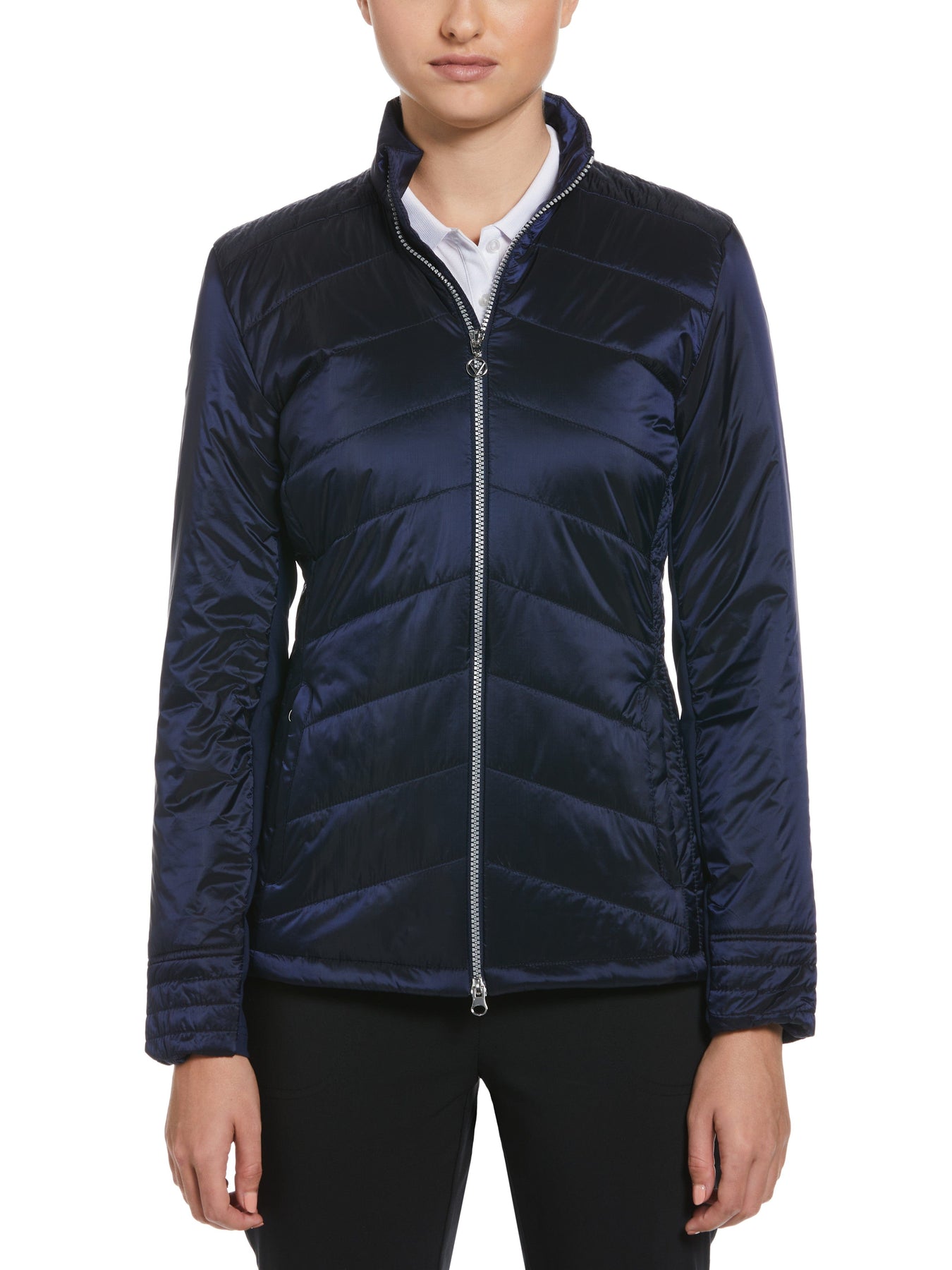 Stay warm and comfortable on the golf course with this women’s full-zip jacket from Callaway. Great for that unpredictable transitional weather, the ladies' golf jacket is quilted and filled with Primaloft® insulation for lightweight warmth. A smart addition to your golf attire, the jacket is water and wind resistant, and it has a high mock collar to help keep your neck protected from the elements. A hint of stretch in the material and Swing Tech™ technology help to maximize your freedom of motion.