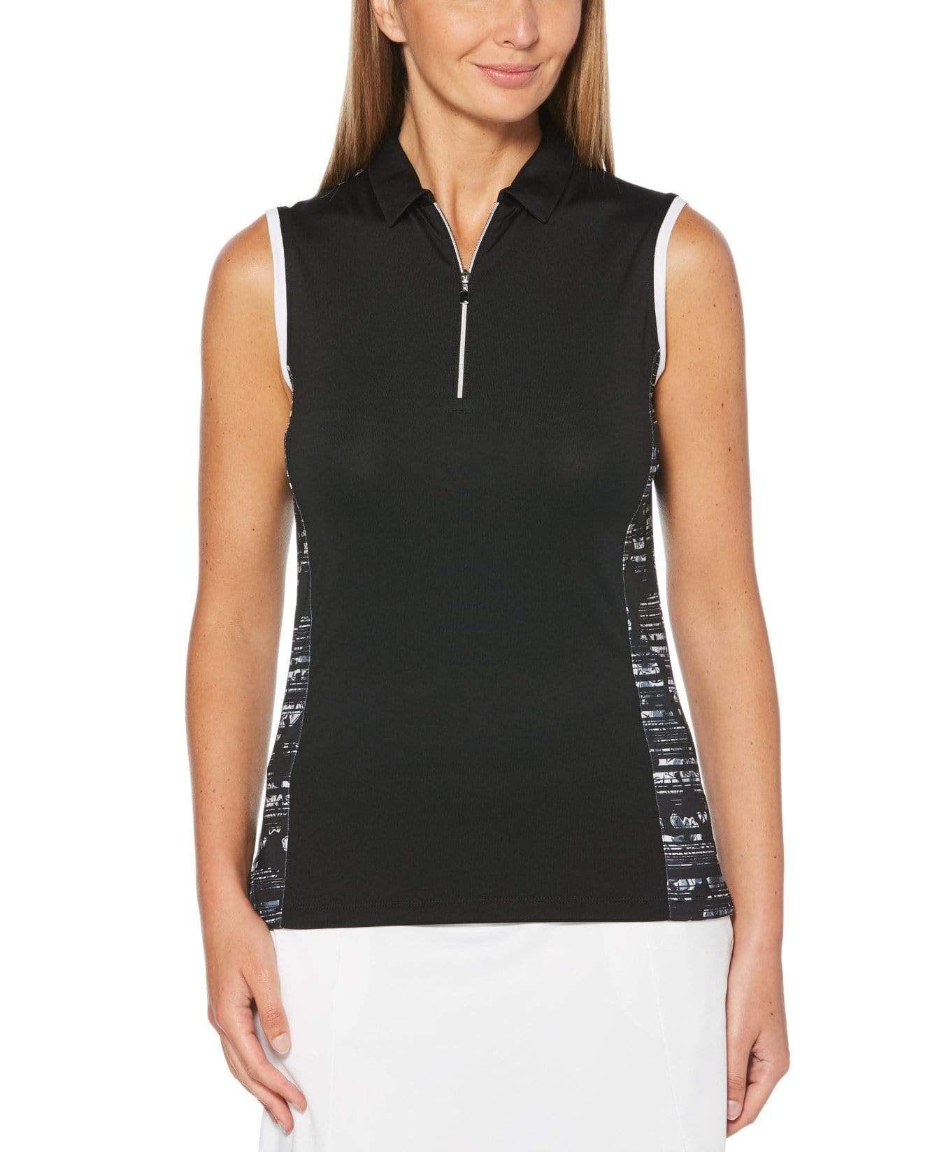 Tee off in style this spring with this sleeveless women's golf shirt. An eye-catching stainglass floral print covers the back and sides of this ladies' golf top while the front and collar are solid for contrast. High quality stretch fabric lets you swing in comfort and moisture-wicking technology helps keep you cool and dry.