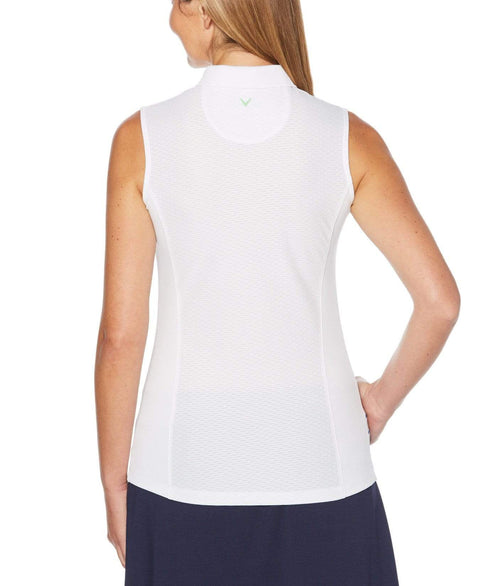 Improve your fashion and golf games with this womens golf shirt from Callaway. With an engineered variegated striped print on the front and a solid collar and back for contrast, this sleeveless golf polo is a smart choice for spring. Featuring a back mesh panel and moisture-wicking technology, the high quality stretch fabric keeps you cool and dry. A stylish drop tail design provides comfortable coverage on the course.