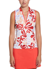 The Women's Summer Abstract Floral Waist Length Top from Callaway Apparel is the perfect blend of fashion and function for the golf course. This sleeveless top features a striking abstract floral print and a flattering waist-length design with a comfortable self-collar. Engineered with performance in mind, it incorporates OptiDri™ moisture-wicking technology to keep you dry and comfortable, Swing Tech™ for unrestricted movement during your swing, and UV Block for essential sun protection. Crafted from a blend of 95% recycled polyester and 5% elastane, this top offers both comfort and a sustainable choice.