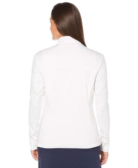 Take more club when the wind picks up, and put on this Callaway mixed media quilted golf jacket. Diamond-shaped quilting is sewed on the sides and upper sleeves and a two-way zipper closure allows you to zip from the bottom and top. Callaway's insulated thermal fabric creates a barrier between you and cold weather.