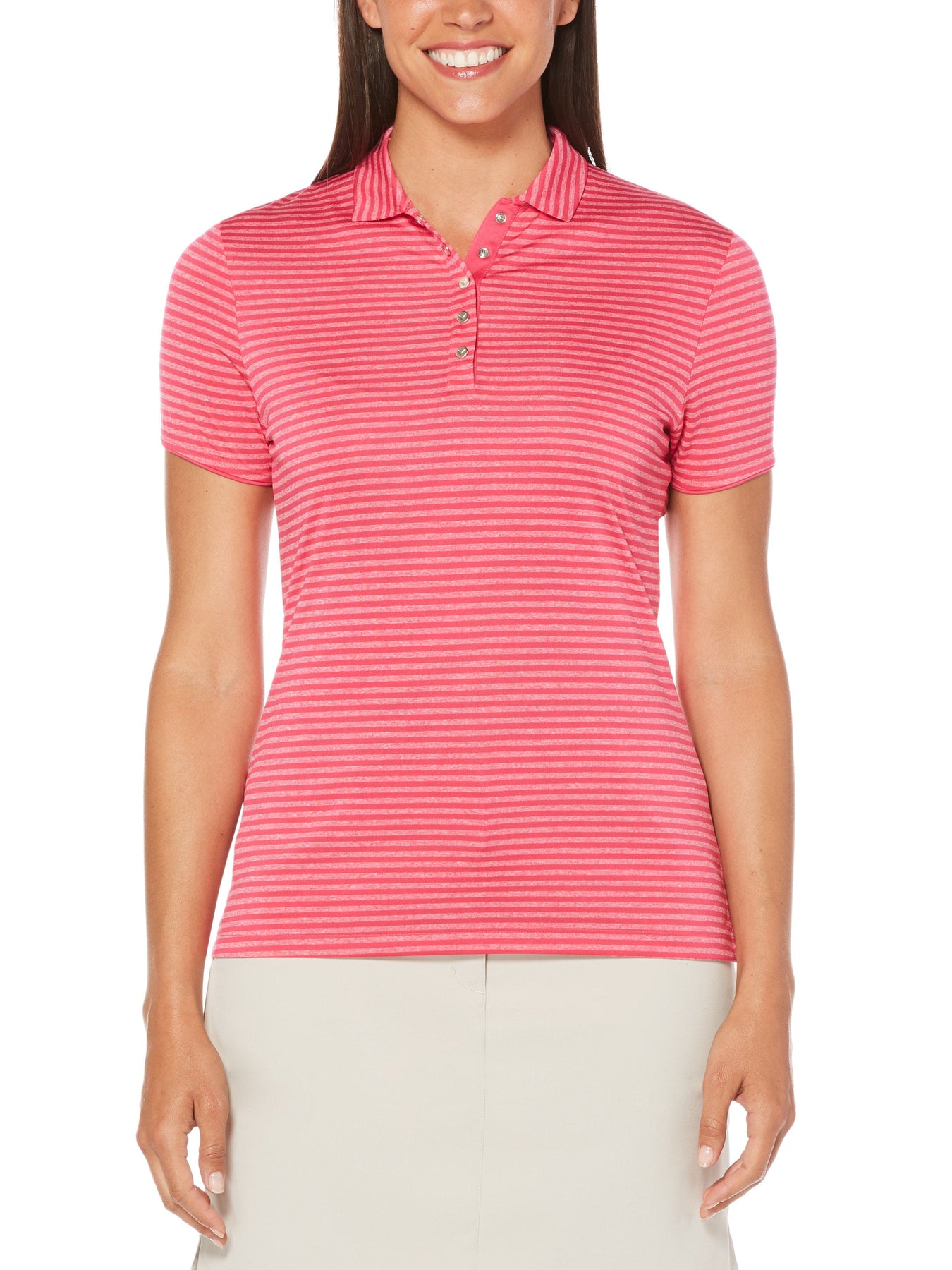 Secure that weekend tee time, grab your clubs, this Callaway tonal stripe polo and hit the course in style. Fairly thin horizontal stripes alternate between a solid-colored and two-tone heather finish to create an extremely fashionable, classic on-course look. Callaway's Opti Dri™ moisture wicking technology pulls sweat away from your body to keep you cool in the heat, stretch fabric is created by interwoven layers that ensure maximum range of motion and UPF 50 provides superior protection by blocking the sun's harmful UV rays.