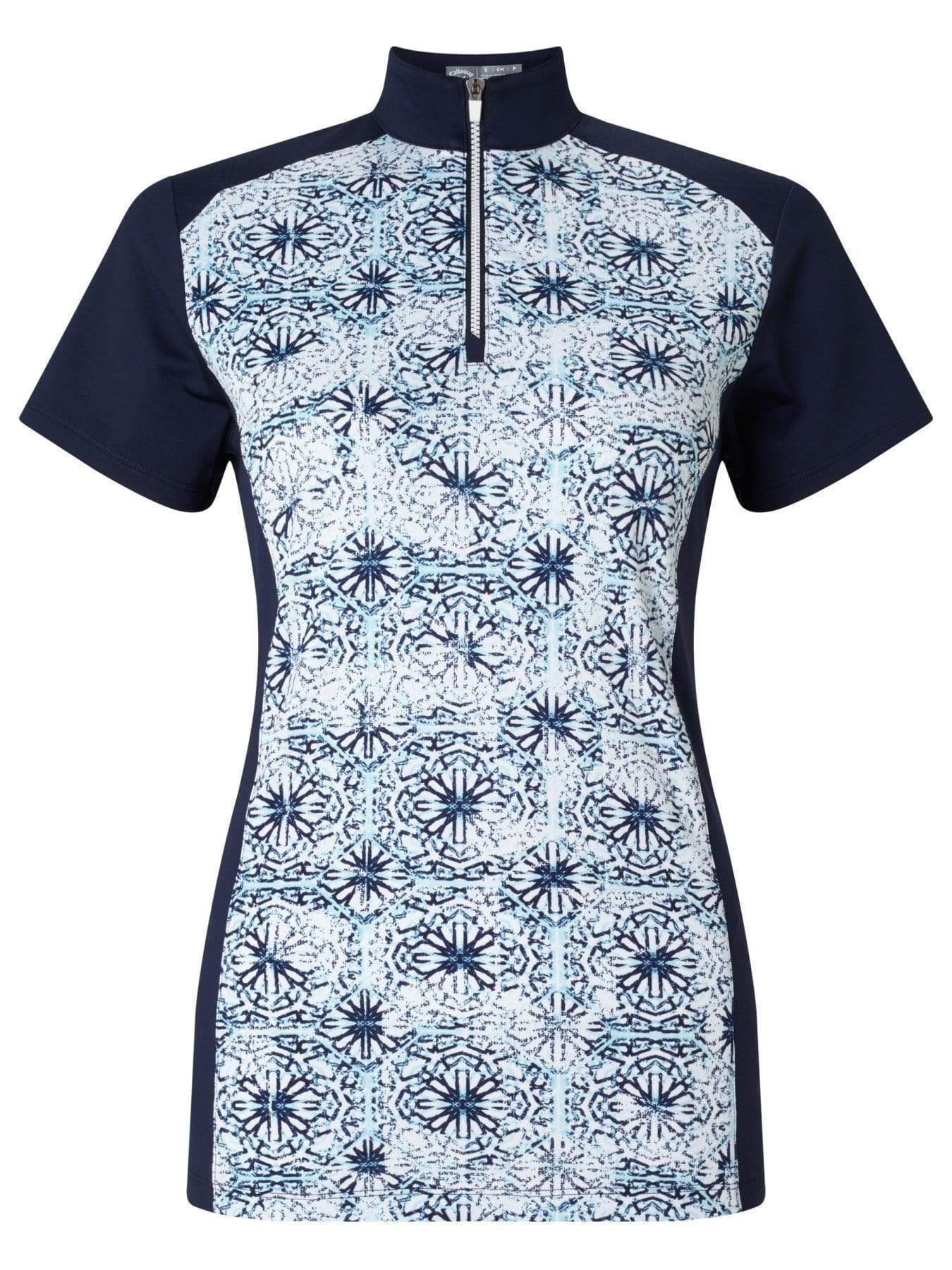 Card a birdie after that pristine knock-down shot in this Callaway kaleidoscope mock polo. A multicolored kaleidoscope print emcompasses the front panel of this short sleeve shirt, creating a stylish addition to your golf wear. It features a mock collar and a quarter-zip placket. Callaway's Opti Dri™ moisture wicking technology pulls sweat away from your body to keep you cool in the heat, stretch fabric is created by interwoven layers that ensure maximum range of motion, ventilated fabric is engineered to keep you cool by circulating air through the garment, and UPF 50 provides superior protection by blocking the sun's harmful UV rays.
